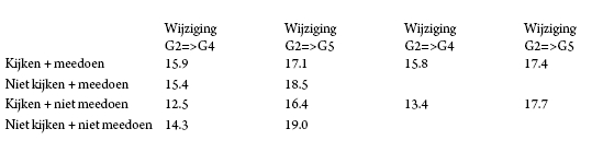 Tabel 1 geeft aan dat de verschillen in volatiliteit tussen de vier blootstellingscondities minimaal zijn. De verschillen in de eerste kolom, wijzigingen tussen golf2 en golf4, zijn niet statistisch significant: mensen die hebben gekeken/meegedaan zijn niet meer van partij gewisseld dan degenen die niet hebben gekeken/meegedaan. Als we in de tweede kolom naar het uiteindelijke stemgedrag kijken (G2=\>G5) dan is het zelfs opvallend dat de mensen die helemaal niet zijn blootgesteld nog het meeste van partij zijn gewisseld.