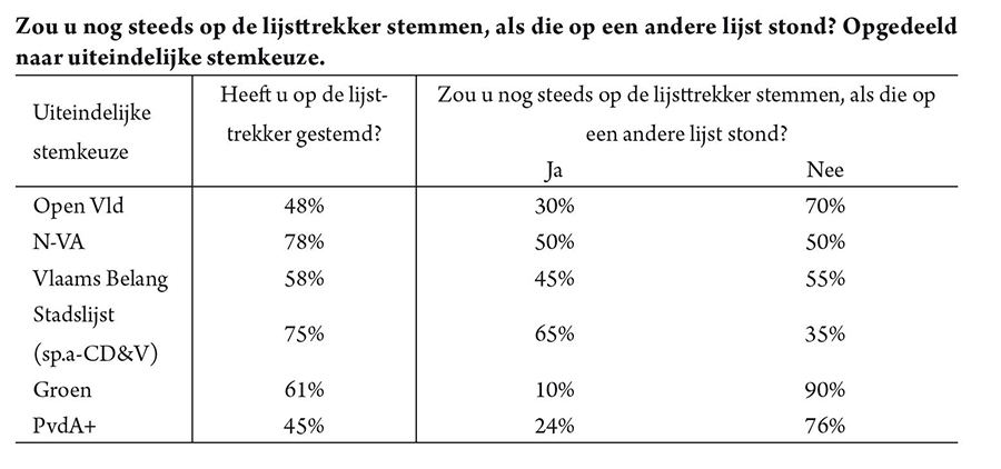 Het belang van lijsttrekkers in verkiezingscampagnes staat buiten kijf, hun precieze belang kan wel sterk schommelen tussen partijen. Bij alle partijen heeft bijna de helft (PvdA en Open Vld) tot drie vierde van de kiezers (Stadslijst, N-VA) een voorkeurstem voor de lijsttrekker uitgebracht. Verder blijkt dat de lijsttrekker vooral bij de Stadslijst doorslaggevend was in de stemkeuze. Want ruim twee derde van de Stadslijst-kiezers zou Patrick Janssens volgen naar een andere partij. Allicht gedeeltelijk het gevolg van de wat partijloze stijl van burgemeester Janssens. Al sluiten we niet uit dat een deel van de kiezers van de Stadslijst in ons panel de afzonderlijke partijen sp.a en CD&V als een andere partij hebben beschouwd. Verder valt op dat de helft van de N-VA-kiezers lijsttrekker De Wever zou volgen naar een andere partij. Daarmee is hij duidelijk van groter belang voor zijn partij dan de lijsttrekkers van Groen, Open Vld en PvdA+.