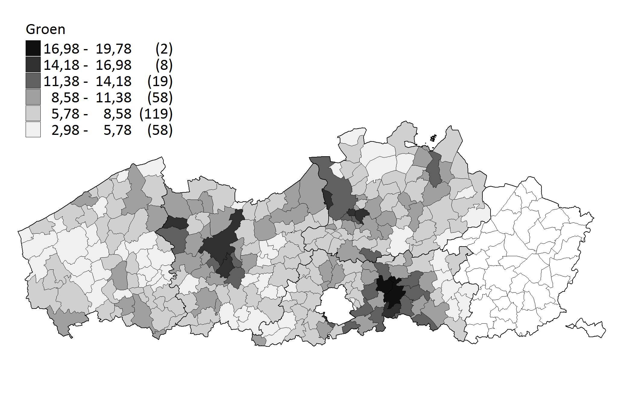 Een gescheiden resultaat in de vier provincies waar Groen en sp.a apart naar de kiezer zijn gegaan, kan meer duidelijkheid brengen of de geografische spreiding van hun achterban samenvalt. Uit Kaart 5 blijkt Groen vooral in en rond Gent, Leuven en Antwerpen (allemaal universiteitssteden) sterk te staan. Het stedelijke profiel komt nog scherper tot uiting bij sp.a (Kaart 6), die het relatief goed doet in Gent, Leuven of Antwerpen maar veel minder in de omringende gemeenten.