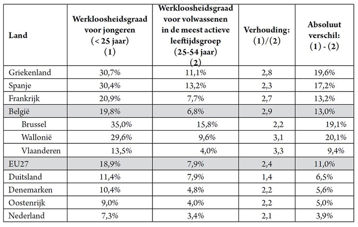 In het publieke discours gaat men er over het algemeen van uit dat de jeugdwerkloosheid in België voornamelijk een probleem vormt in Wallonië en Brussel, maar niet zozeer in Vlaanderen. De cijfers in Tabel 1 weerleggen echter duidelijk deze stelling. De jeugdwerkloosheidsgraden in Brussel en Wallonië zijn inderdaad veel hoger dan in Vlaanderen, maar in geen enkel land of gewest in Tabel 1 is de jeugdwerkloosheidsgraad in verhouding tot die van de meest actieve leeftijdsgroep hoger dan in Vlaanderen. In termen van absolute verschillen presteert Vlaanderen beter, maar wel nog aanzienlijk minder goed dan de best presterende landen van de EU.