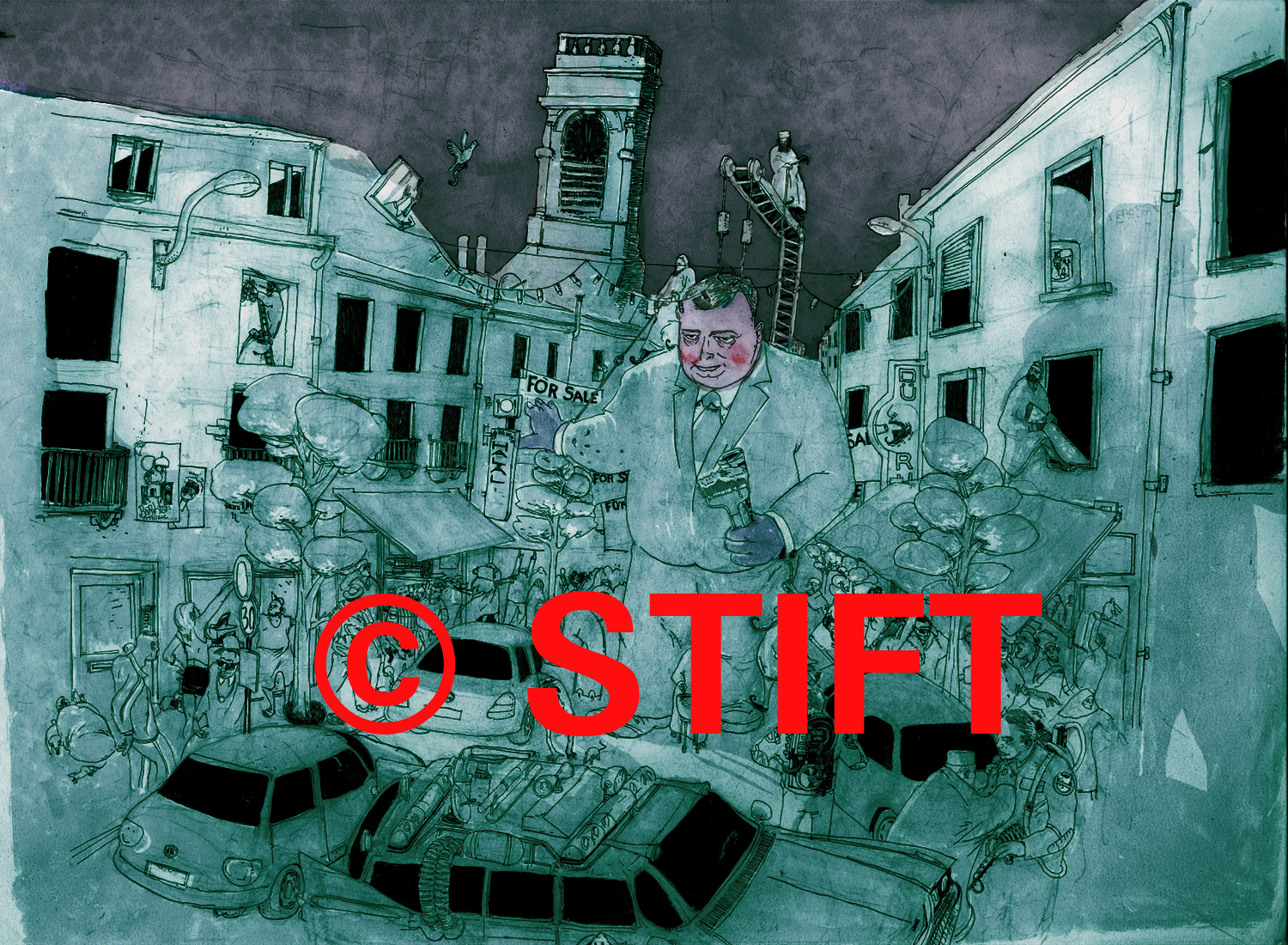 Stefaan Van Hyfte (1983), alias Stift, is een Brusselse illustrator en visuele kunstenaar die sinds 2009 publiceert voor o.a. De Morgen en De Standaard. In 2009 studeerde hij af in grafische kunsten en animatiefilm aan de Sint Lukas hogeschool te Brussel. Onder leiding van Johan Stuyck, Inge Herremans en Leo Fabri, werkt hij verder in z’n vertrouwde background in het opmaken van gearticuleerde Goyaske taferelen, surrealistisch en gebalanceerd tussen schetsen en uitgewerkte illustraties. Zijn grootste verwezenlijking was bij de overburen te Hilversum ten expositie geplaatst voor een retrospectieve tentoonstelling over de carrière van de Nederlandse komiek André Van Duin. Werkend aan zijn debuut, een fijne lijn binnen de illustratie en stripmedium, wil hij zijn lezers graag meenemen in een romantische en surrealistische droom. Op vraag van Sampol tekende hij een aantal campagnecartoons. U vindt zijn werk via de blogspot: stift-illustrator.blogspot.be.