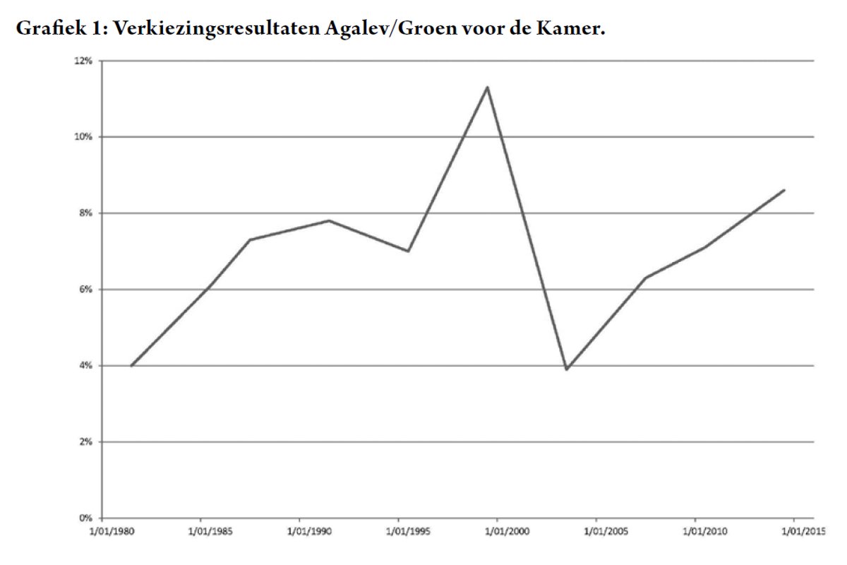 Het is een verdienste, maar ook een beperking. Doorgroeien tot op het niveau dat men mee kan bepalen welke coalities worden gesloten, zit er voorlopig niet in. En er zijn geen tekenen die er op wijzen dat dit in de nabije toekomst zal veranderen. Groen wint op 25 mei federaal voor de derde opeenvolgende keer. Maar dat was voor de verkiezingen van 1995 ook het geval, en toen volgde onverwacht verlies. Je kunt de historische ontwikkeling ook lezen als dat het drie verkiezingen geduurd heeft om de nederlaag van 2003 helemaal te boven te komen. Ondanks de terechte tevredenheid over de winst bij deze verkiezingen moet er ook twijfel zijn of Groen op termijn kan uitgroeien tot een beleidspartij met de stabiele electorale basis die daarvoor nodig is. De uitdagingen op het vlak van milieu, klimaat en energie zijn de voorbije decennia zeker niet afgenomen, maar het thema heeft niet geleid tot een politieke stroming die zich kan meten met de drie traditionele politieke families. Niet in Vlaanderen, en ook niet elders in Europa.
