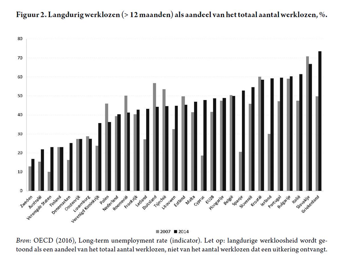 Daarbij moet wel in acht worden genomen dat België een relatief groot aandeel langdurig werklozen kent, dat zijn werklozen die langer dan 1 jaar werkloos zijn. Maar ook hier geldt dat België geen uitzondering is in vergelijking met andere landen. Figuur 2 toont het aandeel langdurig werklozen van het totaal aantal werklozen. In 2014 hebben Ierland, Spanje, Slovenië, Kroatië, Bulgarije, Portugal, Italië, Griekenland en Slowakije een groter aandeel langdurig werklozen dan België. Landen die sterk inzetten op activering (Denemarken, Zweden) en landen die hun arbeidsmarkten weinig reguleren (Australië, Verenigde Staten, Verenigd Koninkrijk), kennen over het algemeen lage niveaus van langdurige werkloosheid. Uiteraard speelt ook de economische conjunctuur een belangrijke rol in het voorkomen van langdurige werkloosheid. De grafiek toont een duidelijk effect van de crisis in landen die er zwaar door werden getroffen (Ierland, Spanje, Italië, Portugal, Griekenland). Ook in 2007 voerde België het lijstje echter niet aan: het aandeel langdurig werklozen was groter in Duitsland, Tsjechië, Bulgarije en Slowakije. Uitkeringen die onbeperkt zijn in de tijd lijken dus niet noodzakelijk tot een uitzonderlijk hoog aandeel langdurig werklozen te leiden.