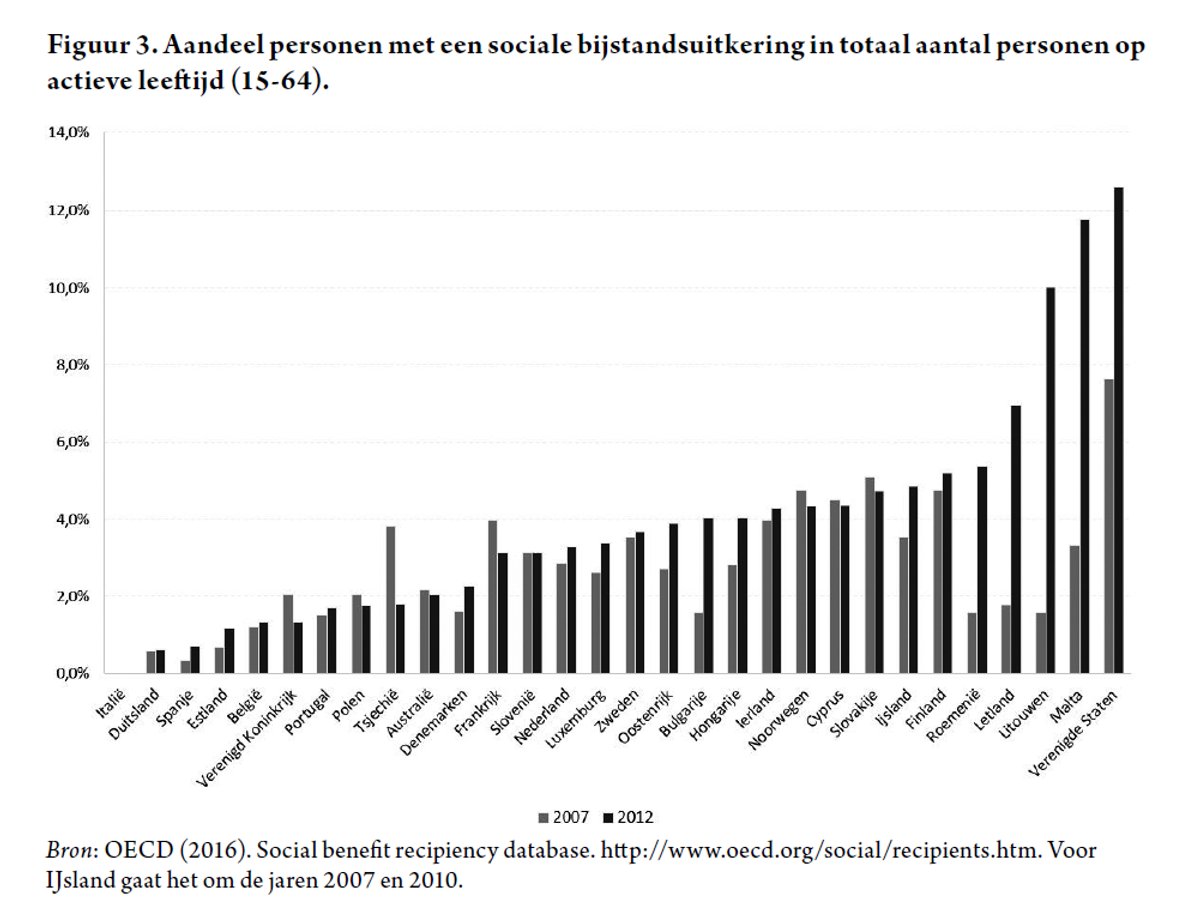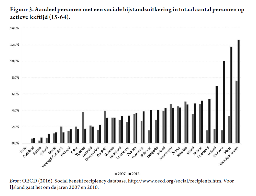 De databank van de OESO die ik hierboven gebruik om de werkloosheidsgegevens mee samen te stellen, biedt ook informatie over het aantal mensen dat een beroep moet doen op sociale bijstandsuitkeringen en invaliditeits- of ziekte-uitkeringen. Dat is relevant omdat de maximale werkloosheidsduur in heel wat landen ingekort werd in de voorbije decennia. In Zweden, bijvoorbeeld, waren de werkloosheidsuitkeringen in 1995 nog de facto onbeperkt in de tijd; nu zijn ze beperkt tot 300 dagen. Wie geen rechten meer heeft binnen het stelsel van de werkloosheidsverzekering stroomt dan over het algemeen door naar het sociale bijstandsstelsel waar men eventueel aanspraak kan maken op een uitkering (indien er voldaan wordt aan de voorwaarden), of stroomt door naar het stelsel van de ziekteverzekering, of verdwijnt uit de statistieken. In België zijn de werkloosheidsuitkeringen onbeperkt in de tijd, en men zou dan ook verwachten dat er minder mensen doorstromen naar de sociale bijstand (het leefloon) of naar de ziekteverzekering.