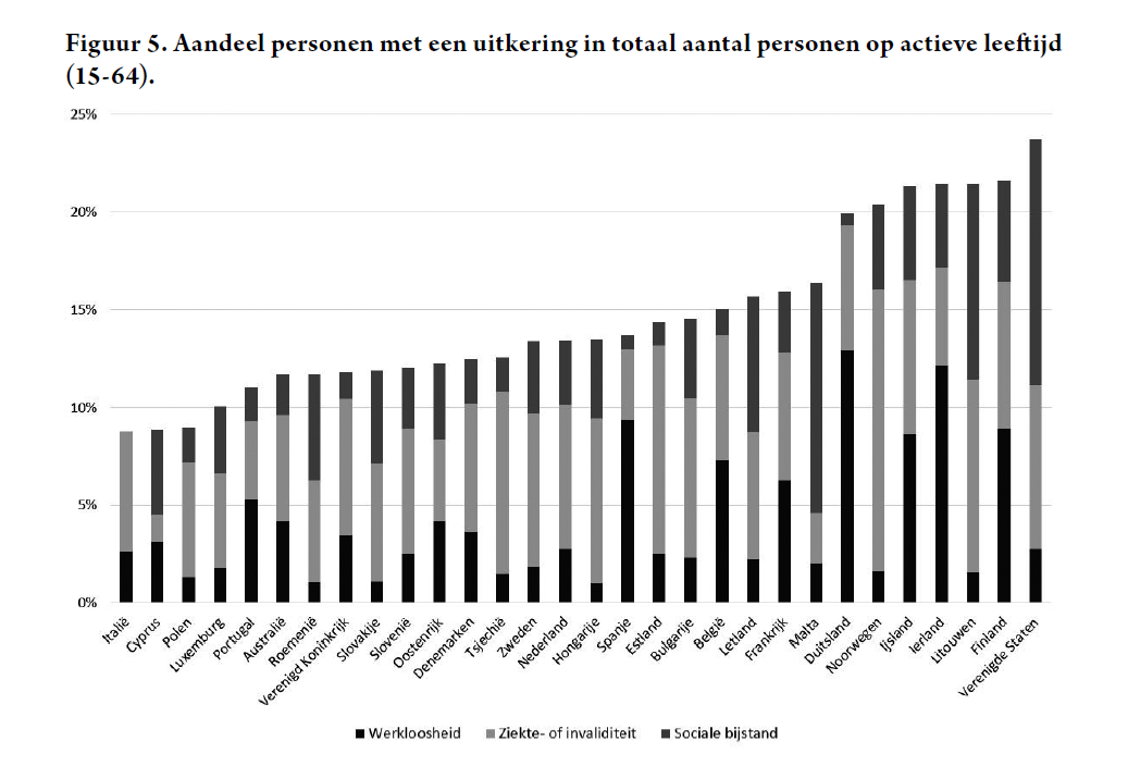 Wanneer we het totale aantal ontvangers van werkloosheid-, ziekte-, invaliditeit en sociale bijstandsuitkeringen onder de loep nemen, dan lijkt België maar weinig gemeen te hebben met het cliché van de uitkeringsstaat. Figuur 5 toont een optelsom van de drie stelsels die we hierboven bespraken, en dat leert ons dat in België relatief weinig personen op actieve leeftijd afhankelijk zijn van een uitkering. In de Verenigde Staten, Finland, Litouwen, Ierland, IJsland, Noorwegen en Duitsland deden minstens 1 op 5 van de actieven een beroep op een uitkering in 2012; in België was dat 1 op 7. Een laag aandeel actieven die een werkloosheidsuitkering ontvangen is dus geen garantie dat er minder mensen een beroep doen op uitkeringen, en bijgevolg geen garantie op minder overheidsuitgaven (zie verder). Dit toont aan hoe belangrijk het is om specifieke uitkeringsstelsels niet in isolement te bekijken.