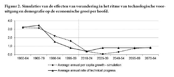 Bij ongewijzigd beleid, en onder de eerder neutrale veronderstelling dat het ritme van technologische vooruitgang zich in de toekomst gedraagt zoals in het recentere verleden (op een vertraging in de huidige periode na), voorspelt recent onderzoek aan de Universiteit Gent voor minstens de komende drie decennia een economische groei per hoofd van de bevolking lager dan 0,5% per jaar (Heylen et al., 2016). De belangrijkste drijvende kracht is de demografische ontwikkeling (vergrijzing). Als bovendien een ondergrens voor de reële rente bestaat, waarvoor vandaag duidelijke aanwijzingen bestaan, en deze dus neerwaarts rigide is, dan kan dit de zwakke groei aanzienlijk versterken.