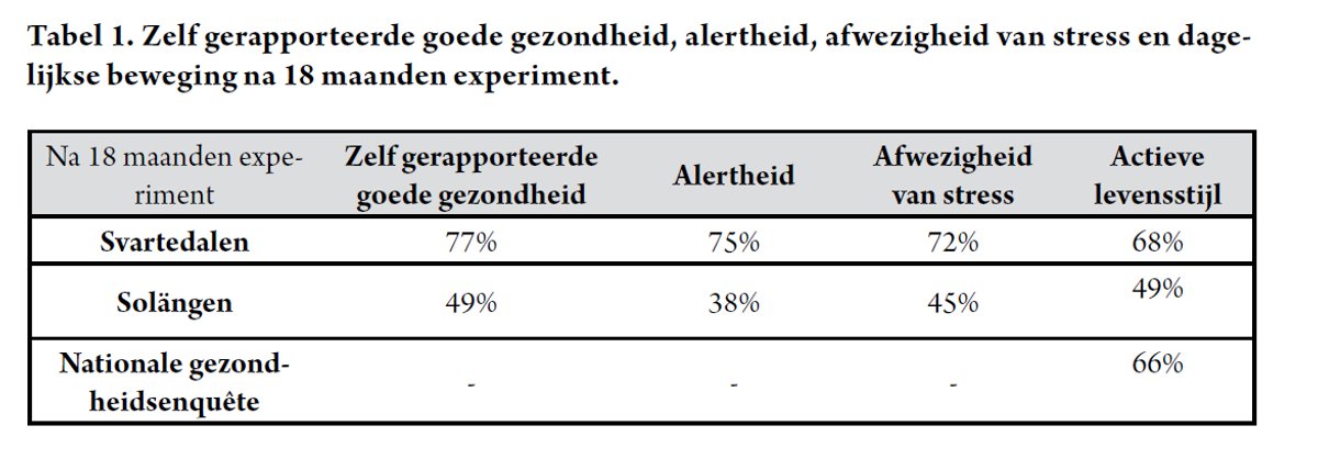 Een kortere werkweek zet tevens aan tot bewegen. In Tabel 1 wordt dagelijkse beweging gedefinieerd als 30 minuten per dag actief zijn door bijvoorbeeld te wandelen, te lopen, te fietsen, enzovoort. Na 18 maanden hadden de verpleegkundigen in Svartedalen een meer actieve levensstijl - ook in vergelijking met de doorsnee Zweed.