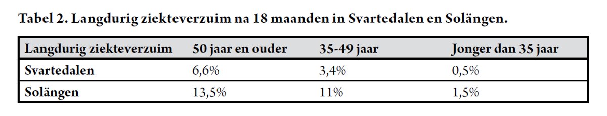 De verbeterde gezondheid van het personeel Svartedalen uit zich ten slotte in de lage cijfers voor langdurig ziekteverzuim (minstens 15 dagen). Vooral bij de groep 50-plussers is het effect uitgesproken. Bij die oudere werknemers ligt het ziekteverzuim na 18 maanden ongeveer op de helft van de cijfers in Solängen.
