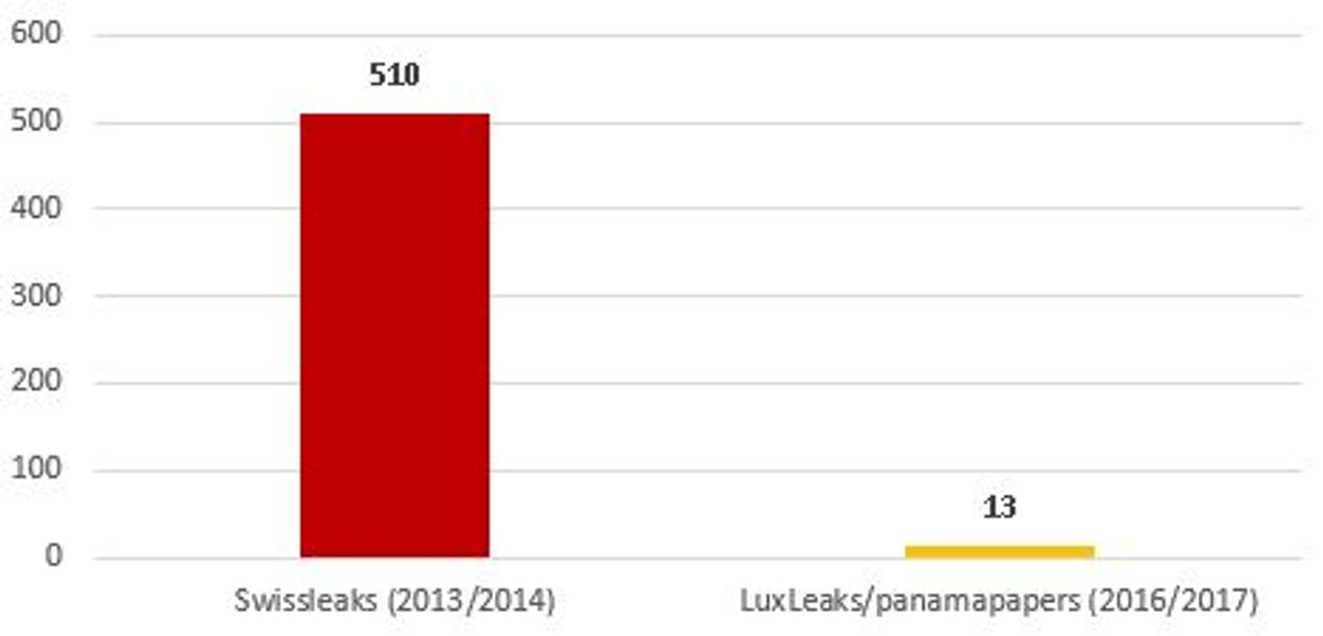 De aanpak op het terrein werd eveneens hertekend in de vorige legislatuur. Nieuw was dat de BBI ook werd ingeschakeld voor de controle van verrekenprijzen van multinationals met een link naar belastingparadijzen. Zo werd in 2013 een controleactie opgezet om bedrijven die Belgische patenten of merken op die manier ontdoken, te ontmaskeren. In minder dan een jaar recupereerde de BBI ruim 250 miljoen euro.22 Nog op het terrein leverde de afhandeling van de zogenoemde SwissLeaks tijdens de vorige legislatuur meer dan 500 miljoen euro op23, terwijl de afhandeling van de grote leaks van deze legislatuur (LuxLeaks en Panama Papers) volgens de cijfers van de minister zelf niet veel meer dan 10 miljoen euro opleverde (Figuur 4). De onderzoeken naar LuxLeaks gaven aanleiding tot 2,7 miljoen euro aan gevestigde inkomstenbelastingen.24 Wat de onderzoeken naar de Panama Papers betreft, staat de teller op 10 miljoen euro.25