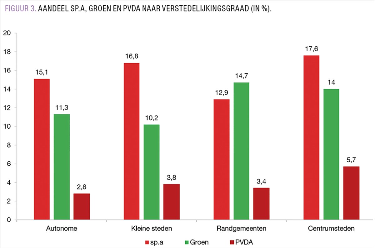 In onze vorige bijdrage schreven we dat Groen veeleer een randstedelijk dan stedelijke profiel bezit. Ofschoon Groen nog altijd het best ingeplant is in de randgemeenten, boekte ze thans de grootste winst in de centrumsteden. Ze verwierf daar 14% van de kiezers. In 2012 diende de partij daar nog genoegen te nemen met 8,8% van het electoraat. Ook in de andere types van gemeenten gaat de groene partij erop vooruit. Ook PVDA behaalde de beste resultaten in de centrumsteden.