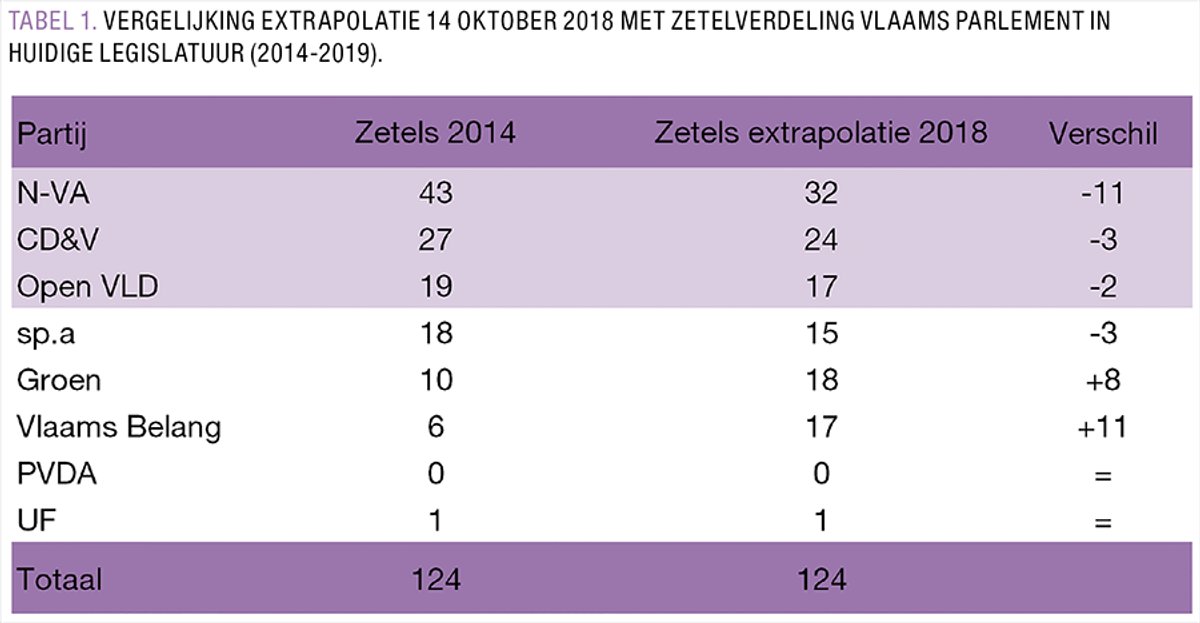 Simulaties van de parlementaire zetelverdelingen op basis van extrapolaties van 14 oktober 2018 tonen aan dat de Vlaamse regering in 2019 haar meerderheid nipt zou behouden en de federale regering haar meerderheid zou verliezen.