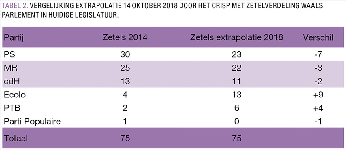 In Tabel 2 wordt een vergelijking gemaakt tussen de huidige zetelverdeling voor het Waals Parlement en de simulatie van het CRISP. Ecolo stijgt van 4 naar 13 zetels. PTB wint 4 zetels. De grote verliezer is de PS die 7 zetels verliest. Ook MR verliest 3, cdH 2 en Parti Populaire 1 zetel. Door deze verschuivingen verliest de huidige regering van MR en cdH haar meerderheid. Ook een coalitie tussen PS en cdH die werd gevormd in 2014 – en nog regeert binnen de Franstalige gemeenschap – heeft geen meerderheid. Een coalitie tussen MR en PS haalt wel een meerderheid. Ook een linkse meerderheidscoalitie tussen PS, Ecolo en PTB zou mogelijk worden.