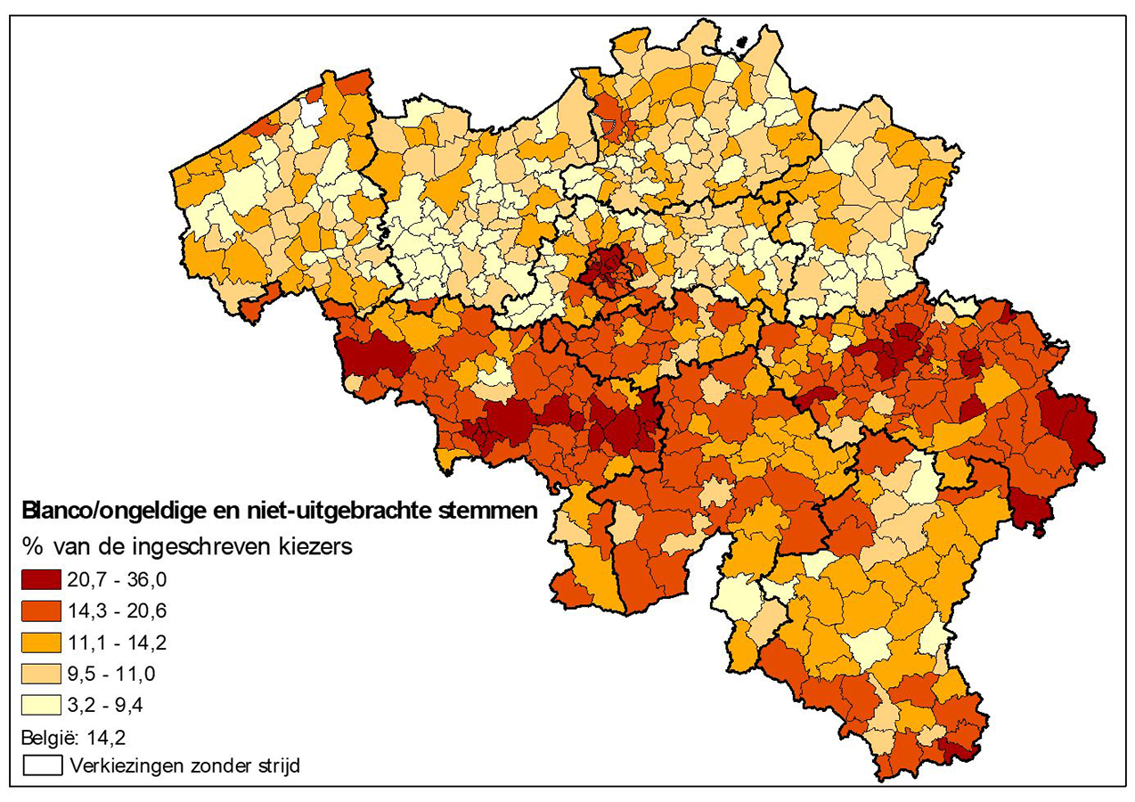 Bij de gemeenteraadsverkiezingen van 2018 brachten meer dan 1 miljoen ingeschreven kiezers geen stem uit, en dat geldt voor bijna 2 miljoen stemgerechtigde kiezers (dus ook niet-Belgen die zich niet inschreven). Als de gehele bevolking op stemgerechtigde leeftijd wordt bekeken (dus ook personen zonder stemrecht) is dat nog meer: dan gaat het om 23% van de volwassen bevolking. Dat is het hoogste cijfer in de laatste 30 jaar. Op gewestelijk en zeker op gemeentelijk niveau kunnen de cijfers nog veel hoger zijn, vooral in stedelijke gebieden: tot meer dan een derde van de ingeschreven kiezers en meer dan de helft van de stemgerechtigde bevolking.