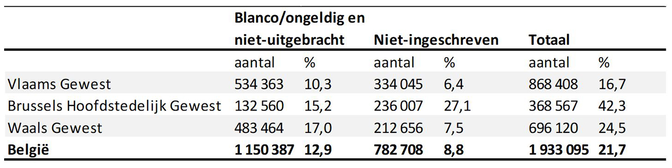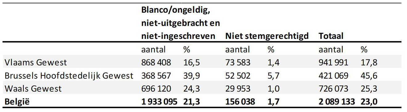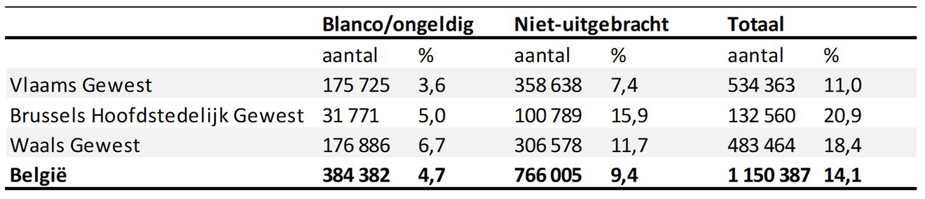 1.150.387 ingeschreven kiezers brachten geen geldige stem uit, hetzij omdat ze blanco of ongeldig stemden, hetzij omdat ze niet kwamen opdagen aan het stemhokje (de niet-uitgebrachte stemmen in tabel 13). Het gaat om 14,1% van de ingeschreven kiezers. Een derde daarvan stemt blanco of ongeldig, de rest komt niet opdagen. De percentages zijn het laagst in Vlaanderen en het hoogst in Brussel, waar het meer dan een vijfde bedraagt. In absolute cijfers is de niet-deelname wel het grootst in het Vlaams Gewest en het kleinst in het Brussels Hoofdstedelijk Gewest.