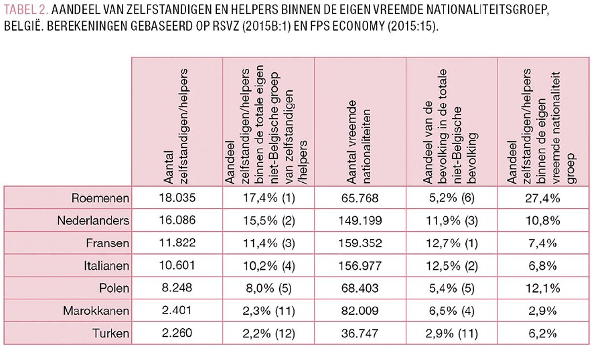 In België bedraagt het aandeel van zelfstandigen in het totaal aantal personen met een job (4,5 miljoen personen) zo'n 14% (664.000 personen) (FPS economy, 2016). Het aandeel van zelfstandigen in de bevolking tussen 15 en 64 jaar oud is 8,9%, wat beneden het EU-gemiddelde van 10,8% ligt. In vergelijking met de buurlanden is dit aandeel kleiner dan in Nederland (12,4%), maar groter dan in Duitsland (8,1%) en Frankrijk (7,5%). In Vlaanderen is het aandeel 9,9% (studiedienst Vlaamse Regering, 2015:141). Het aandeel van niet-Belgische werkgevers en helpers binnen het totale aantal werkgevers en helpers in België is 10,2% (103,630 personen), terwijl het aandeel niet-Belgen in de totale bevolking 11,2% bedraagt (Van den Broucke et al., 2015:80). Berekeningen op basis van data van de Vlaamse Migratie- en Integratiemonitor 2015 en RSVZ (Van den Broucke et al., 2015:80) en RSVZ (2015b:1), tonen aan dat het aandeel van zelfstandigen/ helpers in de totale Belgische bevolking (9,1%) hoger ligt dan het aantal zelfstandigen/ helpers in de totale niet-Belgische bevolking (8,2%). Desalniettemin kende het aantal niet-Belgische werkgevers en helpers een sterke stijging sinds 2010, van 88.459 in 2010 tot 103.630 in december 2014 (+17,15%). Terwijl in diezelfde periode de groei in absolute cijfers groter was onder Belgen (48.146, in vergelijking met 15.171 niet-Belgen), was de groei in percentage groter bij de groep niet-Belgen (17,5% in vergelijking met 5,6% bij Belgen).
