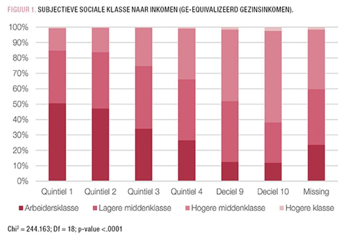 Uit onderzoek blijkt dat objectieve klasseposities (Klasse an sich) en subjectieve klasseposities (Klasse für sich) niet noodzakelijk overeenkomen. Een ruwe analyse van het structurele profiel van de zelfverklaarde middenklassers geeft enkele interessante inzichten. Iemands subjectieve klassepositie hangt weliswaar relatief sterk samen met diens inkomen, opleiding en beroep, maar dit verband is verre van perfect. Hoe hoger het inkomen, opleiding en beroepspositie, hoe groter de kans dat men zich tot een hogere sociale klasse rekent. Zo rekent bijna 90% van de rijkste Belgen (inkomensquintiel 5) zich tot de middenklasse, en dan vooral tot de hogere middenklasse. Wel is het opvallend dat ook ongeveer de helft van de laagste inkomensgroepen (quintiel 1 en 2) zichzelf ook als middenklasse catalogeert. Figuur 1 illustreert dat de subjectieve middenklasse op het vlak van inkomens relatief heterogeen is en al zeker niet eenduidig terug te brengen is tot de 'modale' inkomensgroepen.