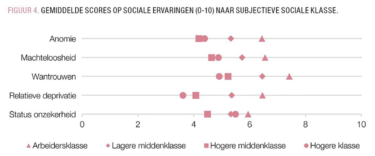 Uit de resultaten volgen enkele interessante vaststellingen. Ten eerste blijkt maatschappelijk onbehagen steevast het sterkst te leven bij de arbeidersklasse. Maar het is vooral treffend dat ook nogal wat lagere middenklassers last hebben van machteloosheid, sociaal wantrouwen, relatieve deprivatie en statusonzekerheid (zie Figuur 4). Deze kwetsbare middenklasse heeft de indruk de controle over het eigen leven en de samenleving te verliezen en voelt zich onrechtmatig benadeeld dan wel onvoldoende gewaardeerd in vergelijking met andere groepen. Het gaat dan wel niet om een verbitterd ressentiment, maar deze groep lijkt bovenal onzeker en ongerust over de toekomst (van hun kinderen) en de richting die de samenleving uitgaat. Dit geeft aan dat sociale veranderingen niet alleen winnaars en verliezers produceren, maar ook een tussengroep van bezorgde kwetsbaren die het almaar minder eenvoudig vinden om hun sociale status te handhaven.