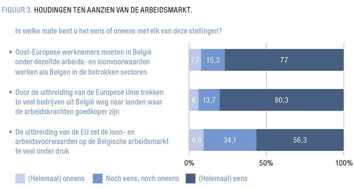 Uit onze gegevens blijkt dat nogal wat Vlamingen bezorgd zijn om de economische gevolgen van Europese integratie voor de Belgische arbeidsmarkt. Zo vindt 56,3% van het Vlaamse electoraat dat de loon-en arbeidsvoorwaarden te veel onder druk komen te staan door de uitbreiding van de EU. Driekwart van de Vlamingen is van mening dat Oost-Europese werknemers in België onder dezelfde arbeids- en loonvoorwaarden moeten werken als Belgen. De angst voor een verlies aan jobs wordt verder bevestigd, aangezien maar liefst acht op de tien Vlamingen aangeven dat de uitbreiding van de EU ertoe leidt dat te veel bedrijven België verlaten ten gunste van landen met lagere loonkosten.