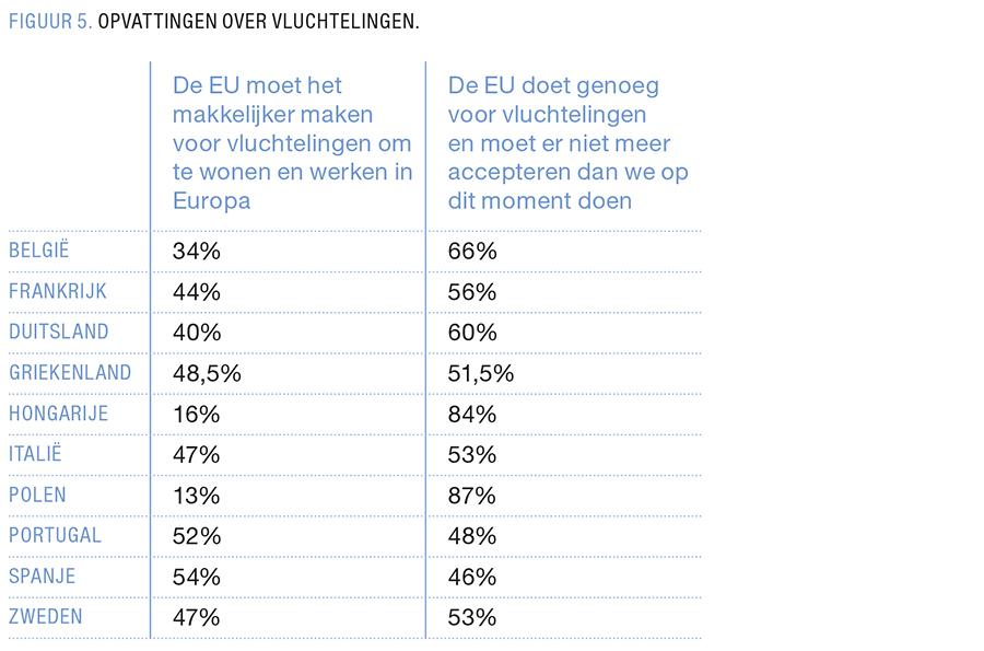8 Bij de stelling 'De EU moet het makkelijker maken voor vluchtelingen om in Europa te leven en werken' vinden we de hoogste percentages in de Zuid-Europese landen Griekenland (48,5%), Italië (47%), Portugal (52%) en Spanje (54%); allen landen waar vluchtelingen op de kusten toekwamen, met uitzondering van Portugal. Opvallend bij deze stelling, en dat geldt voor alle landen, is dat de percentages merkbaar hoger liggen bij millennials tussen 27 en 35 jaar dan bij millennials tussen 18 en 26 (dat zien we ook bij dezelfde stelling over economische migranten).