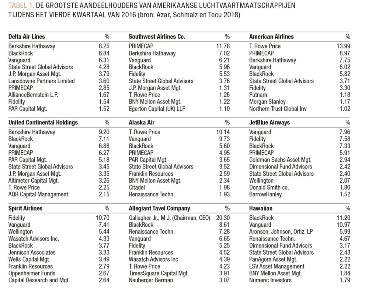 De hamvraag is: neemt common ownership bij concurrerende bedrijven nu echt de prikkels weg om te concurreren, met nadelige gevolgen voor consumenten? Azar, Schmalz en Tecu2 focussen op de Amerikaanse binnenlandse luchtvaartindustrie. Waar je zou kunnen verwachten dat deze industrie competitief is omdat luchtvaartmaatschappijen concurreren op dezelfde routes, tonen de auteurs aan dat de consument hiervan niet profiteert. Het aandeelhouderschap van de luchtvaartmaatschappijen is grotendeels in handen van institutionele beleggers (TABEL 1). In hun onderzoek over de relatie tussen common ownership en de prijzen van vliegtuigtickets vinden ze dat op routes waar er meer common ownership is de concurrentie afzwakt, waarbij de prijzen van vliegtuigtickets 3 tot 7% duurder zijn dan op andere routes. Ook ontdekken ze dat het aantal passagiers negatief gerelateerd is aan de verandering in common ownership, wat aangeeft dat de prijsstijgingen niet worden gedreven door een stijgende vraag.