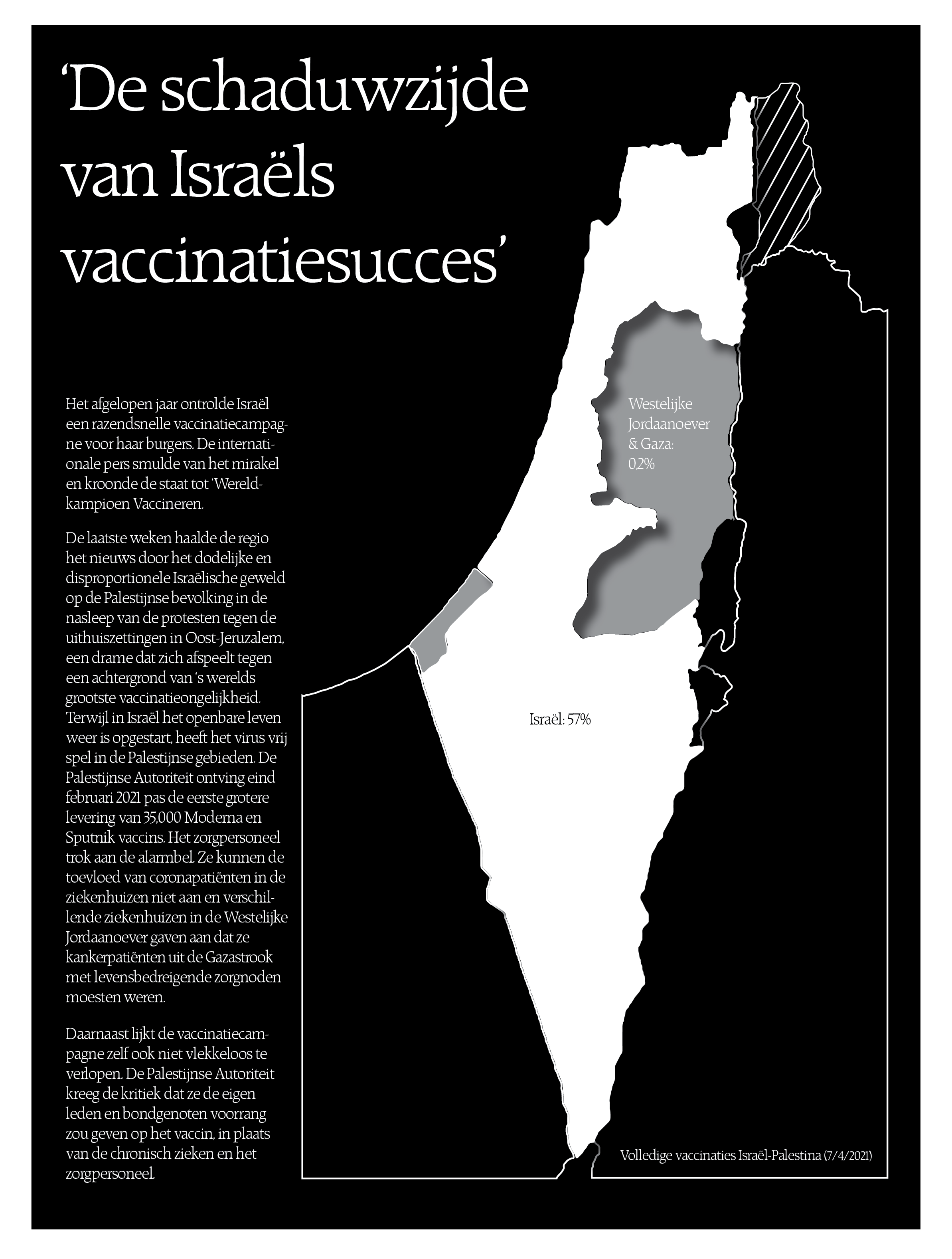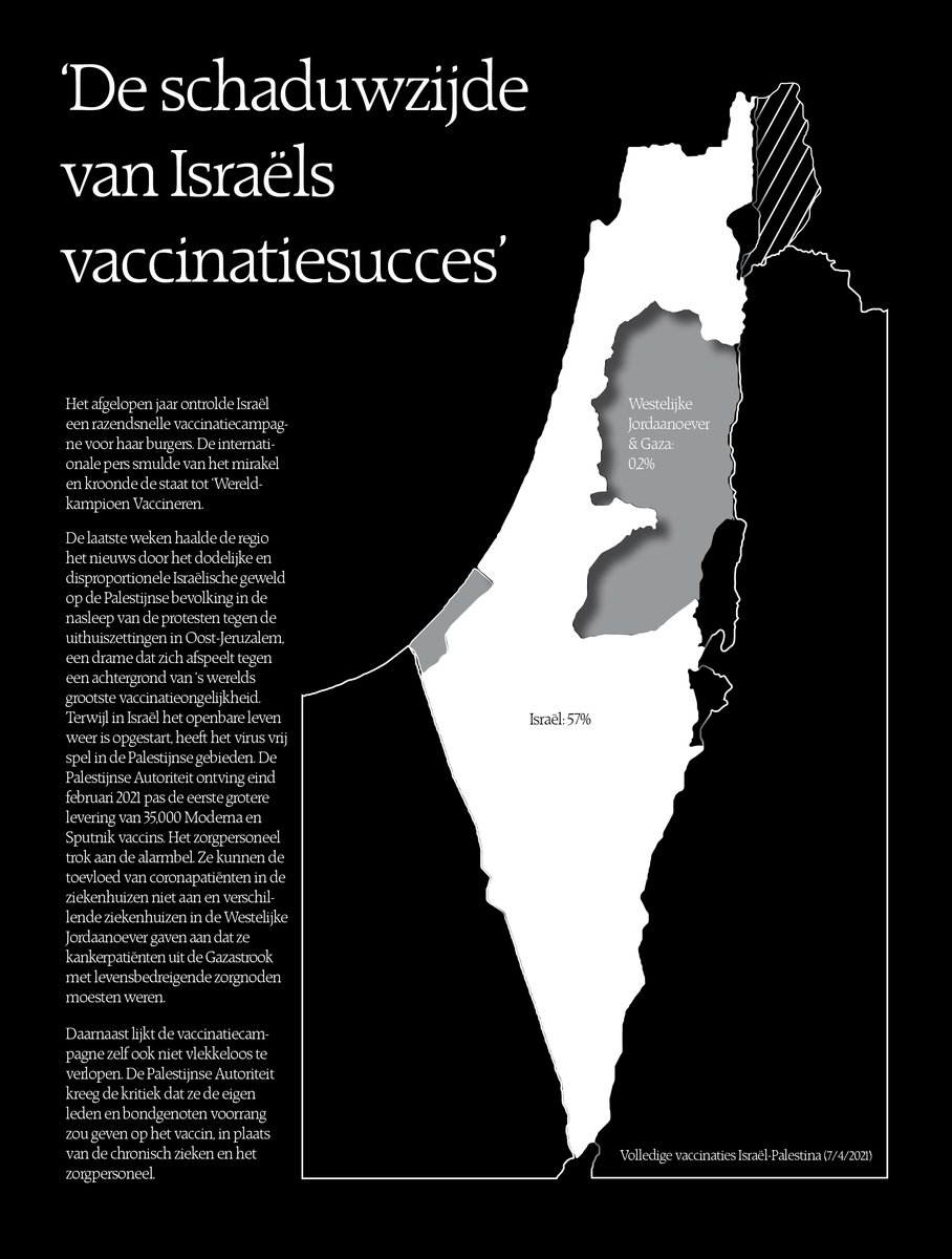 Het afgelopen jaar ontrolde Israël een razendsnelle vaccinatiecampagne voor zijn burgers. De internationale pers smulde van het mirakel en kroonde de staat tot 'Wereldkampioen Vaccineren'. Terwijl in Israël het openbare leven weer is opgestart, heeft het virus echter vrij spel in de Palestijnse gebieden. De laatste weken haalde de regio het nieuws door het dodelijke en volgens velen disproportionele Israëlische geweld op de Palestijnse bevolking in de nasleep van de protesten tegen de uithuiszettingen in Oost-Jerusalem, een drama dat zich afspeelt tegen een achtergrond van 's werelds grootste vaccinatieongelijkheid.