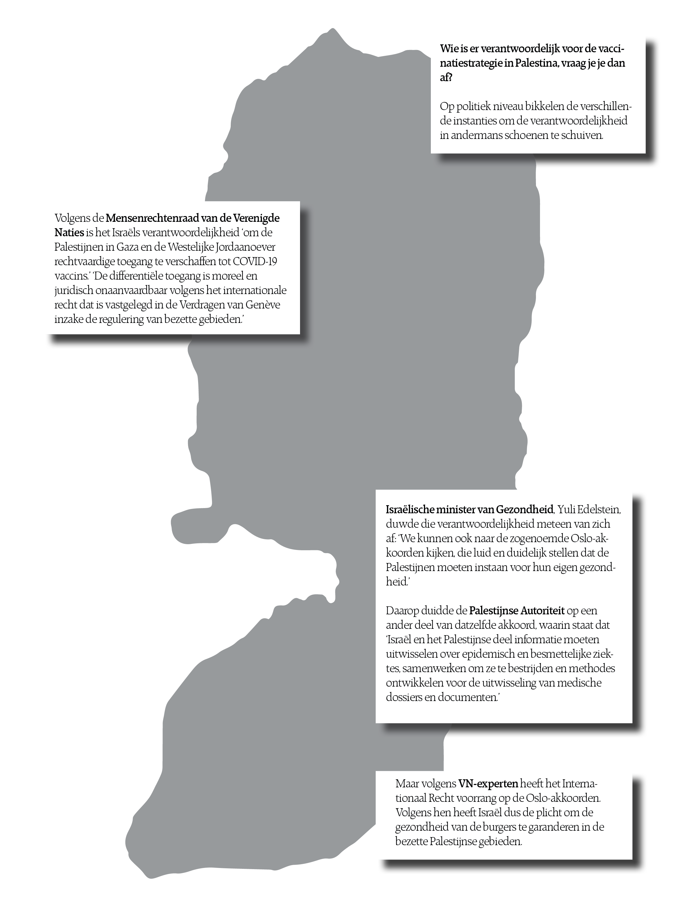 Maar wiens verantwoordelijkheid is de vaccinatie in Palestina eigenlijk? Volgens de Mensenrechtenraad van de VN is het Israëls verantwoordelijkheid om de Palestijnen in de Gazastrook en de Westelijke Jordaanoever toegang te verschaffen tot Covid-19 vaccins, aangezien Israël wordt beschouwd als de bezettende macht. 'De differentiële toegang is moreel en juridisch onaanvaardbaar volgens het internationale recht dat is vastgelegd in de Verdragen van Genève inzake de regulering van bezette gebieden,' zo liet het VN-orgaan weten in een officiële verklaring. Israëls minister van Gezondheid, Yuli Edelstein, schudde die beschuldiging meteen van zich af. 'We kunnen ook naar de zogenoemde Oslo-akkoorden kijken, die luid en duidelijk stellen dat de Palestijnen moeten instaan voor hun eigen gezondheid. Daarop duidde de Palestijnse autoriteit op een ander deel van datzelfde akkoord, waarin staat dat Israël en het Palestijnse deel informatie moeten uitwisselen over epidemische en besmettelijke ziektes, samenwerken om ze te bestrijden en methodes ontwikkelen voor de uitwisseling van medische dossiers en documenten. Volgens VN-experten, echter, heeft het Internationaal Recht voorrang op de Oslo-akkoorden. Volgens hen heeft Israël dus de plicht om de gezondheid van de burgers te garanderen in de bezette Palestijnse gebieden.