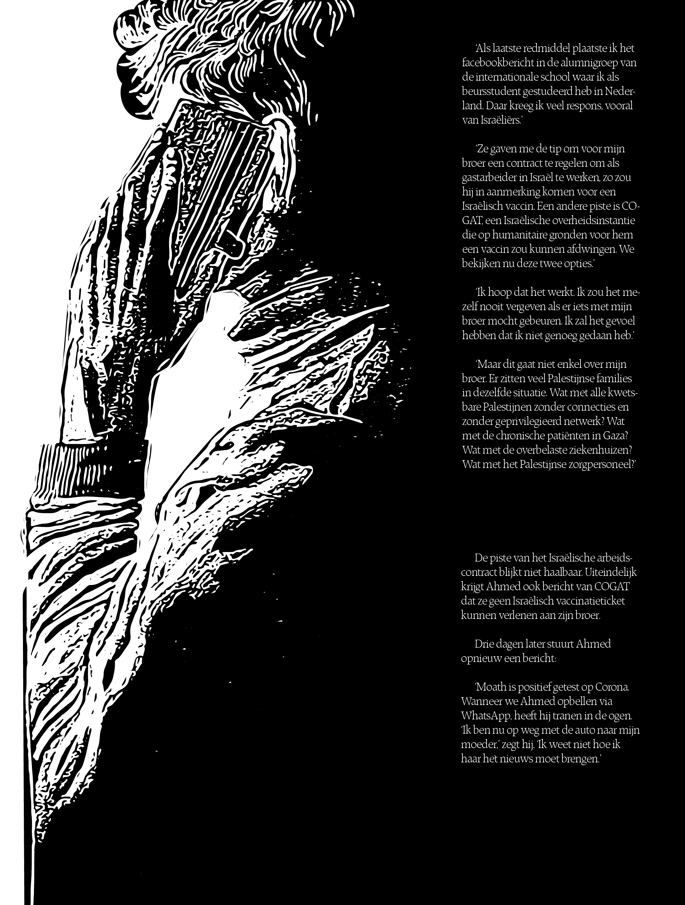 Eén van de slachtoffers van de gebrekkige vaccinatiestrategie is Ahmeds jongere broer Moath Arafat. Door zijn astma en COPD is hij een risicopatiënt. Ahmed werkt en woont in de Verenigde Staten, samen met zijn moeder, maar de rest van het gezin leeft in Palestina. Ahmed: 'Mijn broer is taxibestuurder. Hij heeft veel risicocontacten. Mijn moeder en ik zeggen dat hij thuis moet blijven, maar mijn vader en ooms verplichten hem om te werken. Ze rekenen op zijn inkomsten. In Palestina bestaat er geen vangnet voor tijdelijk werklozen.' Ahmed gaat verder: 'De samenleving gaat heel slecht om met de pandemie. Corona wordt gezien als aeeb, iets om je voor te schamen, net als kanker. Veel mensen in mijn dorp geloven in de samenzweringstheorieën over het virus die de ronde doen. Daarnaast is het ook heel moeilijk om een vaccin te verkrijgen zonder connecties binnen de cirkel van de Palestijnse autoriteit.'