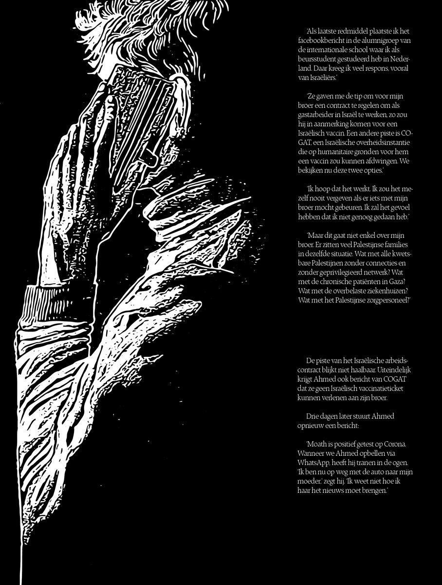 Uiteindelijk lukte het Ahmeds familie niet om Moath tijdig te laten vaccineren. Een week na het eerste interview laat Ahmed weten dat zijn broer positief is getest op Covid-19. Wanneer hij belt via WhatsApp heeft hij tranen in de ogen. 'Ik ben nu op weg met de auto naar mijn moeder,' zegt hij. 'Ik weet niet hoe ik haar het nieuws moet brengen.' Het verhaal van Moath is veelzeggend voor de situatie van de Palestijnen te midden de mondiale gezondheidscrisis. Door een gebrek aan effectief leiderschap ontbeert de Palestijnse bevolking de basisrechten zoals gestipuleerd in de Universele Verklaring van de Rechten van de Mens, waar ook Israël ondertekenaar van is. De Palestijnse autoriteit en de staat Israël pingpongen de verantwoordelijkheid voor de gezondheid van de Palestijnen heen en weer, een spel dat vele levens kan kosten. Op 10 april tekende de internationale site 'Our World in Data' een zevendaags gemiddelde van 22 doden per dag op in de Palestijnse gebieden, op een bevolking van 4,7 miljoen. 'Het aantal positieve gevallen zit op het hoogste niveau sinds het begin van de pandemie,' trok Dr. Pablo Nahuel Sanchez, arts op de Intensieve Zorgafdeling van het Dura ziekenhuis in Hebron aan de alarmbel.