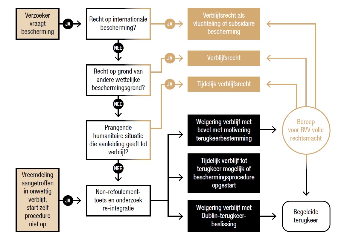 Aan het einde van de procedure wordt ofwel een verblijfsrecht toegekend, dat kan verschillen naargelang de rechtsgrond, ofwel wordt een beslissing afgeleverd in het kader van een begeleid terugkeertraject. Duidelijk en gemotiveerd.