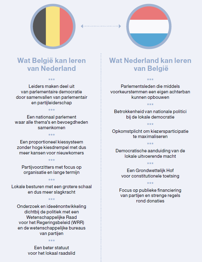 De pijnpunten zijn soms gelijkaardig aan die van ons land. Soms zijn ze net verschillend. Inzake democratische structuren zouden we eerder moeten proberen het beste van de twee landen op te tellen. Het uitgangspunt van die analyse is eigenlijk gelijkaardig voor België en Nederland. Het is een focus op structuren, eerder dan op cultuur, mentaliteit of talent. Het probleem is niet wie onze politici zijn, maar hoe wel hoe ze moeten werken en in welke context.