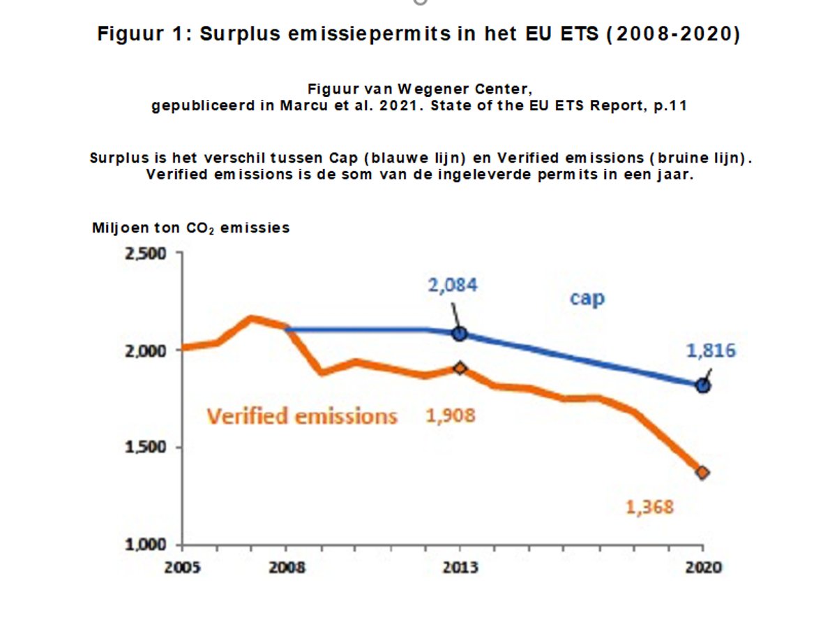 De praktijk, echter, is dat sinds de start van EU ETS in 2005 de jaarlijkse Caps veel te ruim zijn door het uitdelen van gratis permits, nog verruimd door de financiële crisis in 2008 en door Covid in 2020, buiten het ETS ontwikkelde technologie van windturbines, fotovoltaïsche panelen (PV), en anderen. De Caps zijn poreus door de import van permits uit niet-EU-landen en door de koolstoflekken via Europa's de-industrialisering. Jaar na jaar overschrijdt de Cap ruim het totaal van de feitelijke emissies (FIGUUR 1) Dat ETS Cap de emissies van de industrie zou beknotten, is dus een fabel.