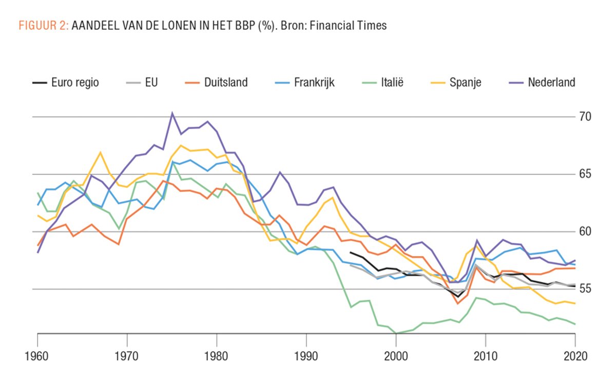 Een dergelijke situatie kenden we in de decennia na de Tweede Wereldoorlog. Lonen (en arbeidsvoorwaarden) stegen mee met de prijzen en de productiviteit, waardoor de winstmarges van bedrijven constant bleven, of zelfs daalden (FIGUUR 2). Wat er sindsdien is veranderd, is niet een plotse afname van de concurrentie waardoor oligopolisten ineens meer winst konden maken, maar een (georganiseerde) afkalving van de vakbondsmacht, waardoor de lonen niet meer meestegen met de inflatie en/of de productiviteit. Het resultaat is de situatie waar we nu in zitten: torenhoge winsten bij het bedrijfsleven, stijgende ongelijkheid en een dalend aandeel van de lonen in de economie. Wanneer bedrijven de macht hebben om de prijzen te laten stijgen, moeten werknemers die macht balanceren en vechten voor hogere lonen.