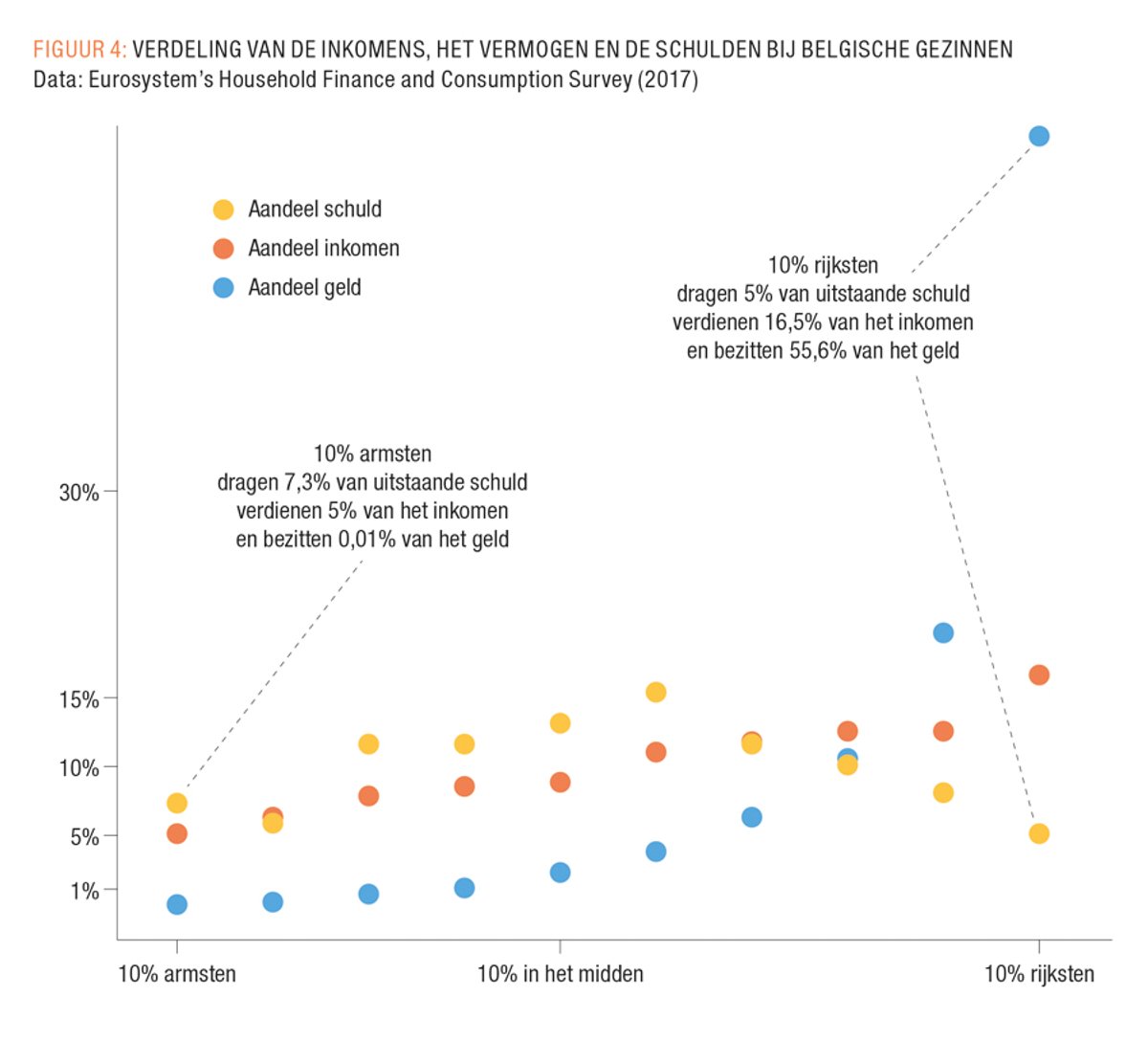 Inflatie hoeft geen groot probleem te zijn indien de lonen mee stijgen, en zij die uit de boot vallen worden ondersteund. Inflatie kan in dat geval zelfs een positief effect hebben op de vermogensongelijkheid. Wie spaart verliest, wie schulden heeft wint. Om de reële impact van inflatie op de samenleving te bepalen is het dus belangrijk om te kijken naar de verdeling van zowel het spaargeld als de uitstaande schuld. FIGUUR 4 geeft een indicatie van de verdeling van het geld op betaal- en spaarrekeningen, het inkomen en de totale uitstaande schuld op basis van de beschikbare data voor België uit de Household Finance and Consumption Survey (2017). Dat spaargeld lijkt heel erg geconcentreerd aan de top van de vermogensverdeling, terwijl de schulden vooral bij de middenklasse zitten in de vorm van hypotheken. Een inflatieopleving kan wat betreft vermogens dus macro-economisch herverdelend werken. Mensen met een flinke spaarpot verliezen wat, mensen met schulden winnen wat en voor mensen zonder een van beide verandert er niks en is het enige wat telt het huidige inkomen. Wat betreft het effect op vermogens is er dus weinig reden tot zorg; de impliciete herverdeling zou zelfs welkom kunnen zijn. Ook de overheid heeft baat bij hogere inflatie, de schuldgraad neemt af en e reële rentelasten zijn negatief. Ook dat is een positief effect van de inflatie.