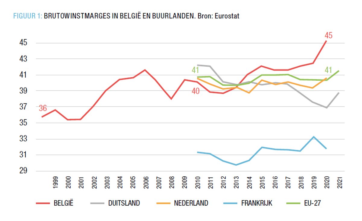 Het was Pierre Wunsch, gouverneur van de Nationale Bank en van liberale signatuur, die de kat aan de bel bond: de winstmarges van Belgische ondernemingen zijn historisch hoog.3 Veel hoger dan in onze buurlanden, terwijl de concurrentiepositie tegenover die buurlanden net hét argument is dat werkgeversorganisatie gebruiken voor een indexsprong (FIGUUR 1). Waar de brutowinstmarges (voor belasting) tien jaar geleden nog rond 39% schommelden, stegen die vorig jaar tot 45%. En ondertussen werd het tarief van de vennootschapsbelasting verlaagd, wat wil zeggen dat de marges nà belasting nog meer stegen.