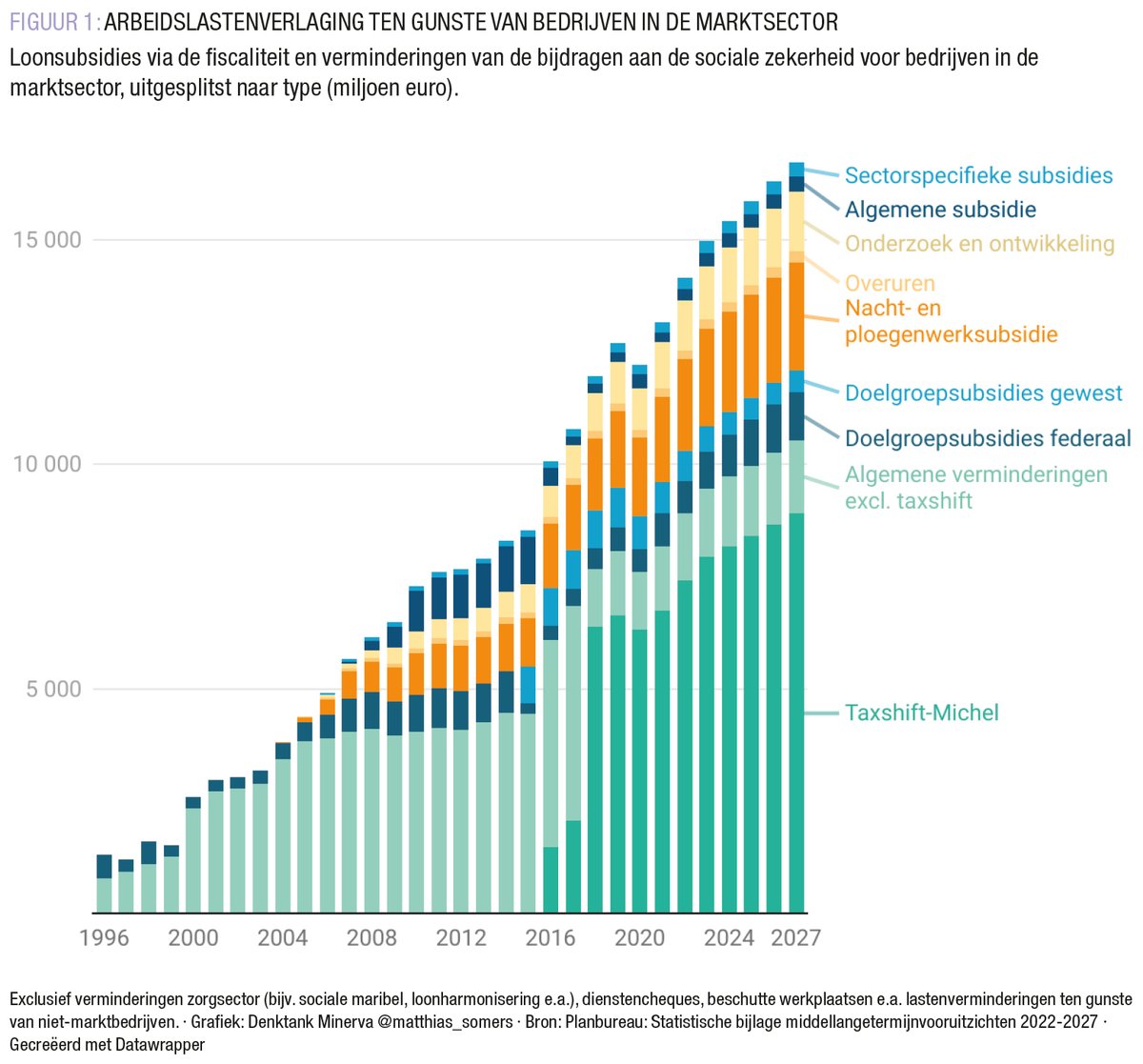 Voor dit jaar schat het Planbureau dat bedrijven in de marktsector zo kunnen genieten van 14,2 miljard euro aan arbeidslastenverlagingen (FIGUUR 1): 10,3 miljard euro door toegekende verminderingen op de verschuldigde bijdragen aan de sociale zekerheid (inclusief de algemene verlaging van de bijdragevoet die deel uitmaakte van de taks shift onder de regering-Michel), en 3,9 miljard euro bekostigd via de federale fiscaliteit (zoals de vrijstelling van doorstorting van de bedrijfsvoorheffing). Bijdrage- en belastingverminderingen ten bate van de zorgsector, van beschutte werkplaatsen, de activering van werkloosheidsuitkeringen, en de subsidiëring van de dienstencheques zijn hierbij niet inbegrepen. Om die bedragen in perspectief te plaatsen: voor dit jaar rekent het Planbureau dat de sociale zekerheid zo'n 17,3 miljard euro zal moeten voorzien voor uitkeringen voor ziekte en invaliditeit én voor werkloosheid samen.