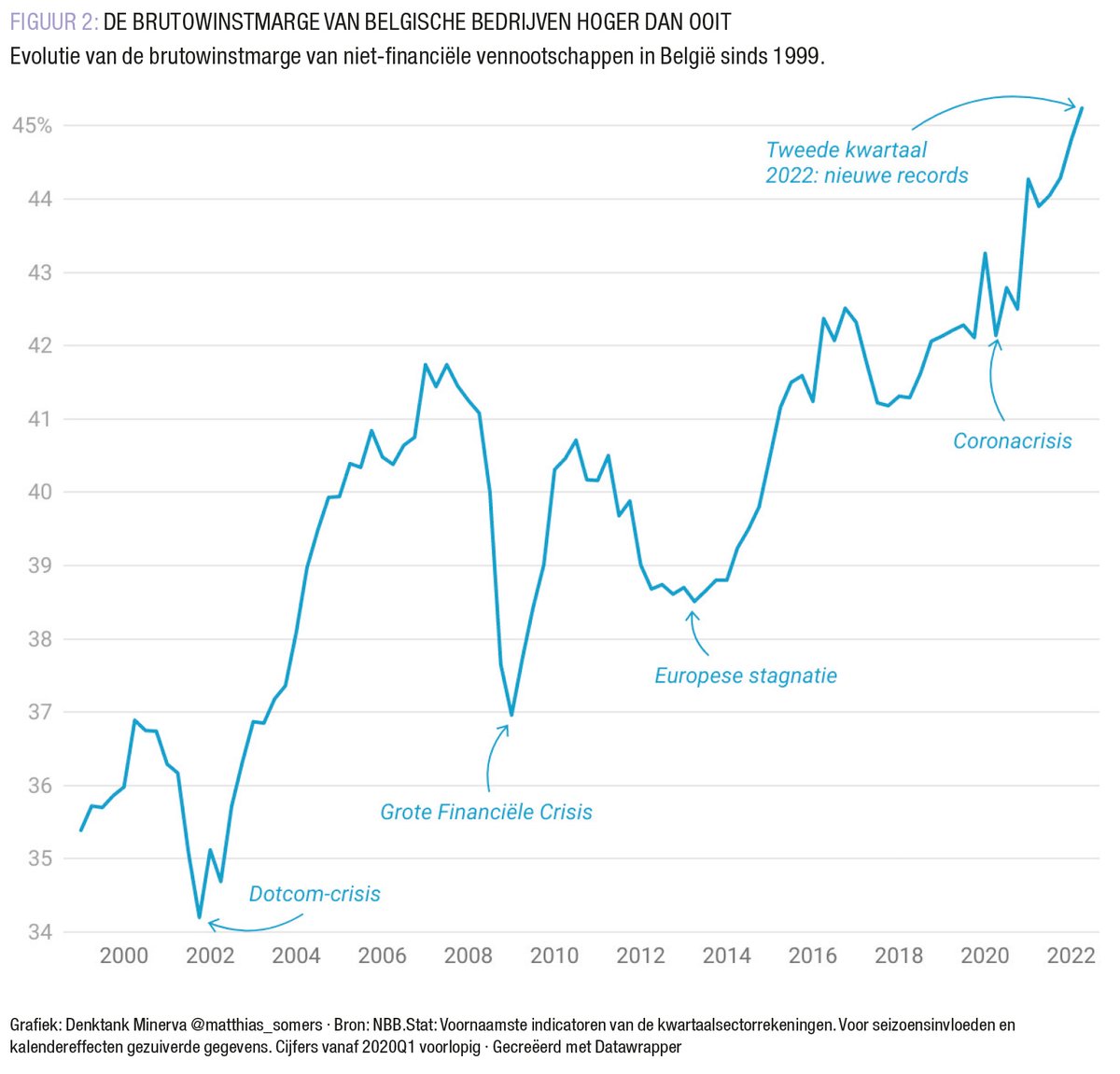 (3) De resem belastingverminderingen en verminderingen van de verschuldigde sociale bijdragen, besproken onder punt 3 (supra), die de loonkost fors doen dalen, worden bij de berekening van de beschikbare marge voor loonsverhogingen genegeerd: bij de berekening van de ontwikkeling van de loonkost doet men alsof bedrijven niet kunnen genieten van de nochtans forse lastenverlagingen in hun voordeel. De idee hierachter is eenvoudig. De overheid kent deze voordelen toe met als motivatie de prijs van arbeid in België te verlagen in vergelijking met de prijs van arbeid in het buitenland. Als vervolgens loonkostverlaging integraal wordt omgezet in een verhoging van de lonen en de uiteindelijke prijs die bedrijven moeten betalen voor arbeid dus even hoog ligt als vóór de lastenverlaging, dan mist die lastenverlaging zijn doel, het verbeteren van de concurrentiepositie van 'onze' bedrijven door het verlaging van de loonkost. De loonnormwet bouwt daarom expliciet een mechanisme in om te beletten dat de verlaging van de loonkost omgezet wordt in hogere lonen, en dus ten goede zou komen aan werknemers: het volledige toegekende voordeel moet 'blijven plakken' in het bedrijf. Het resultaat vandaag is dat de brutowinstmarge van de niet-financiële vennootschappen in België historisch hoge toppen scheert (FIGUUR 2).