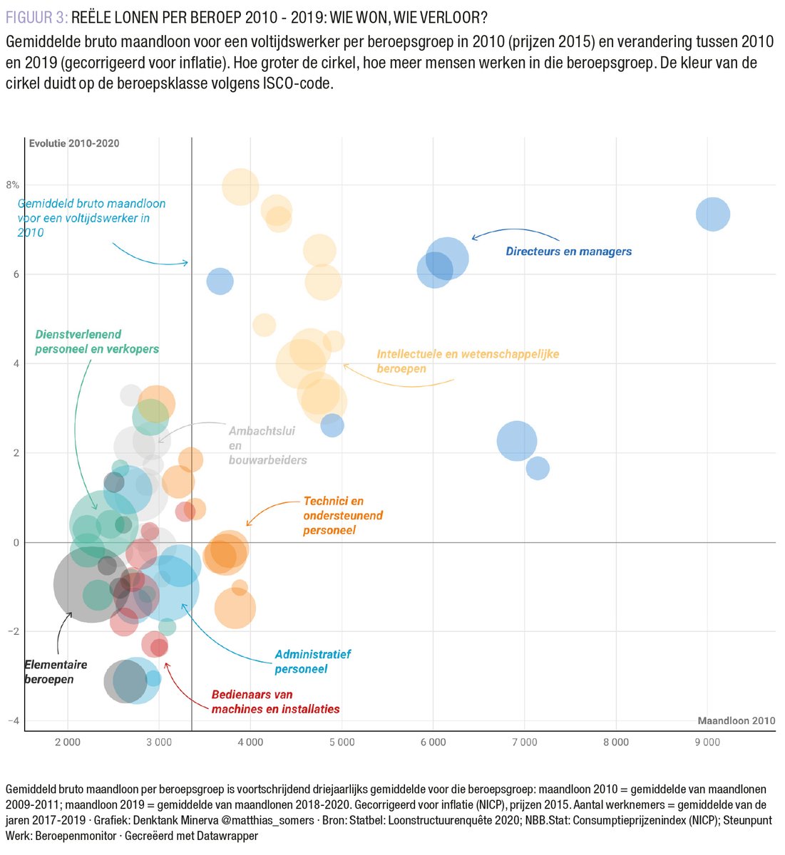 Tweede vaststelling. Een nog nauwkeuriger beeld hiervan krijgen we wanneer we de gemiddelde lonen per beroepsgroep bekijken. We vergelijken hier hoeveel een werknemer die een bepaald beroep uitoefende gemiddeld verdiende in 2010 met hoeveel een werknemer die datzelfde beroep uitoefende gemiddeld verdiende in 2019, gecorrigeerd voor inflatie. Op FIGUUR 3 brengen we dit in beeld: hoe meer naar rechts op de grafiek de cirkel, hoe hoger het loon in die beroepsgroep in 2010; hoe hoger de cirkel, hoe meer het loon voor die beroepsgroep tussen 2010 en 2019 steeg. Meteen zien we dat de hogere lonen ook het meeste stegen, terwijl een belangrijke cluster van beroepsgroepen, met lagere lonen, zich op of zelfs onder de grens van 0% bevindt: hun loon stagneerde, of ging er zelfs op achteruit.