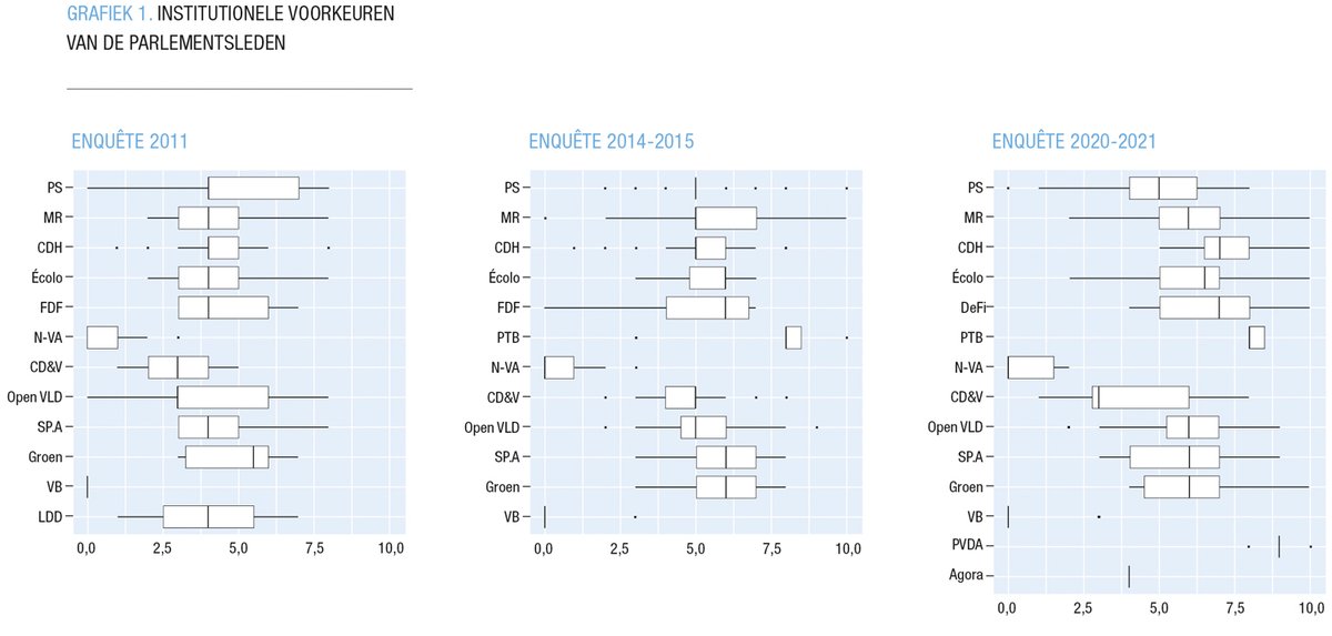 In wat voorafging hebben we de parlementsleden weergegeven volgens hun partij-aanhorigheid. Het is echter relevant om de resultaten ook op te splitsen per parlement en gemeenschap, wat ons kan helpen om de institutionele voorkeuren van de ondervraagde parlementsleden beter te begrijpen. Om ze nog verder te proberen verklaren, integreren we vervolgens deze variabelen in een verklaringsmodel door ze aan te vullen met individuele variabelen.