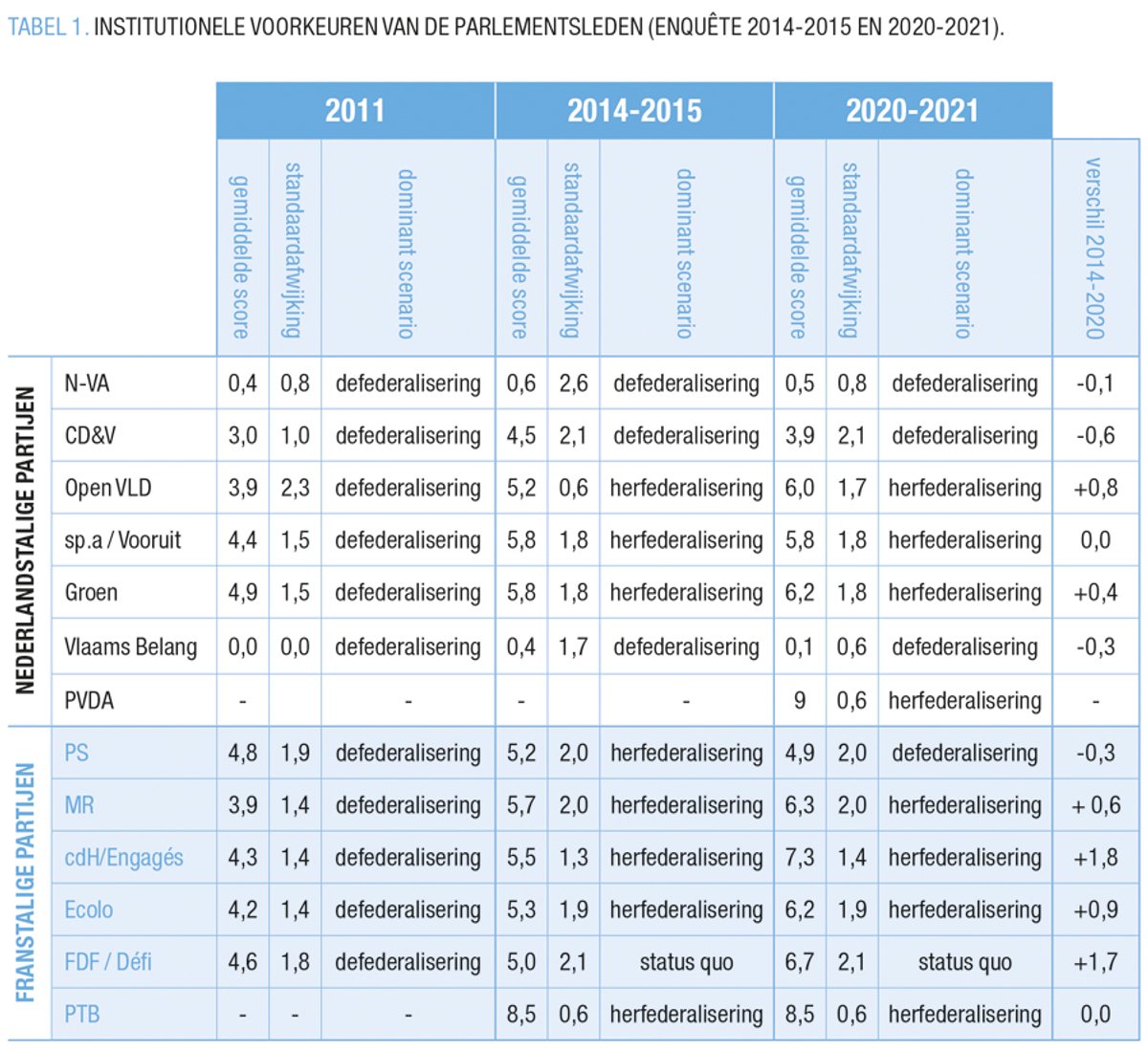Net als in 2014-2015 noteren we in het Vlaams Parlement de positie die het meest naar defederalisering neigt: de gemiddelde score is daar 3,3 (tegenover 3,4 vijf jaar eerder). Dit is natuurlijk logisch, aangezien de Vlaams-nationalistische partijen die de laagste scores laten optekenen, daar het sterkst vertegenwoordigd zijn. De gemiddelde positie van de leden van het Federaal Parlement ging tussen de twee onderzoeken van status quo (5,0) naar herfederalisering (5,4). In het Waalse en Brusselse Parlement zijn parlementsleden het sterkst geëvolueerd en ook het meest voorstander van het herfederaliseringsscenario: de gemiddelde scores zijn respectievelijk 6,0 en 6,8 (tegenover 5,2 en 5,5 voorheen). De parlementsleden van het Brusselse Hoofdstedelijk Gewest zijn dus wederom degenen die zich het meest herkennen in een dynamiek van herfederalisering. In tegenstelling tot hierboven, hebben we in deze tabel ook de Duitstalige parlementsleden opgenomen, die gemiddeld rond het status quo hangen (5.1).