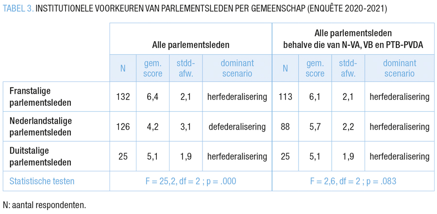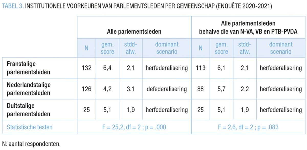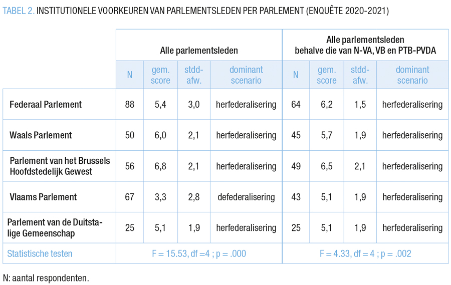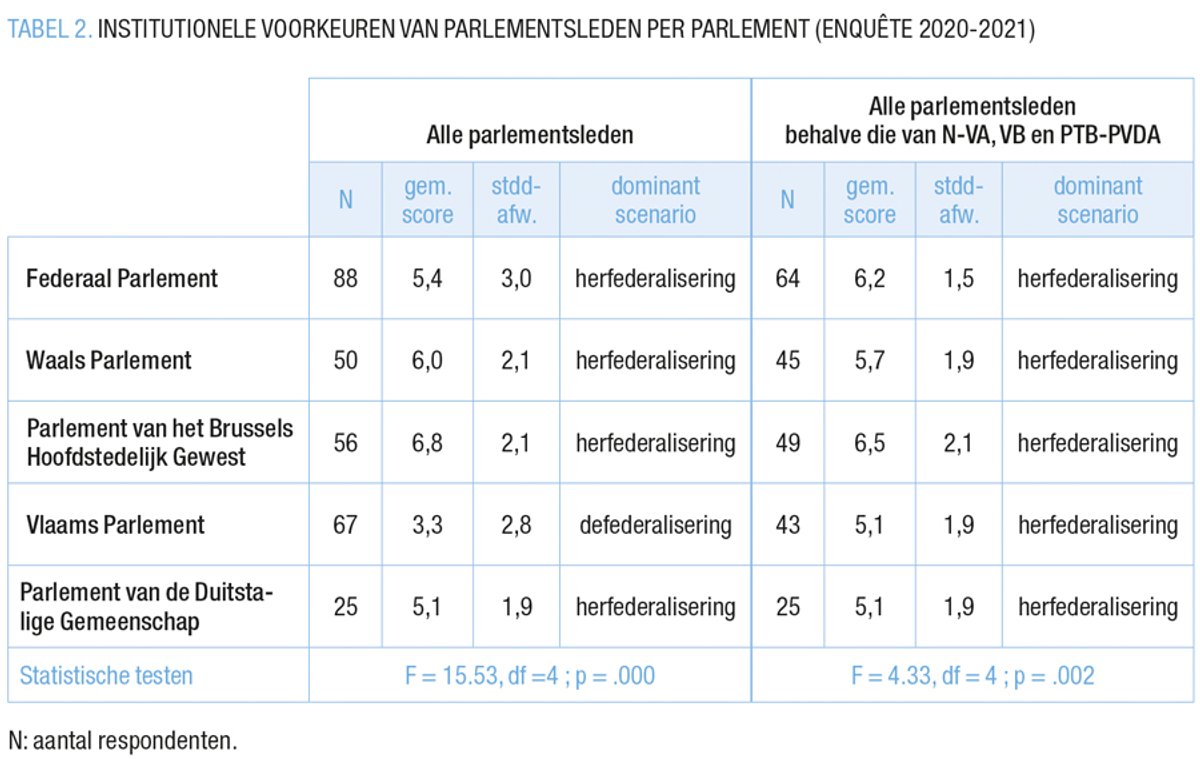Uit TABEL 2 blijkt dat er tussen de vijf onderzochte parlementen – Federaal (Kamer en Senaat), Vlaams, Waals, Brussels en Duitstalig parlement – een statistisch significant verschil bestaat in de antwoorden van de parlementsleden.