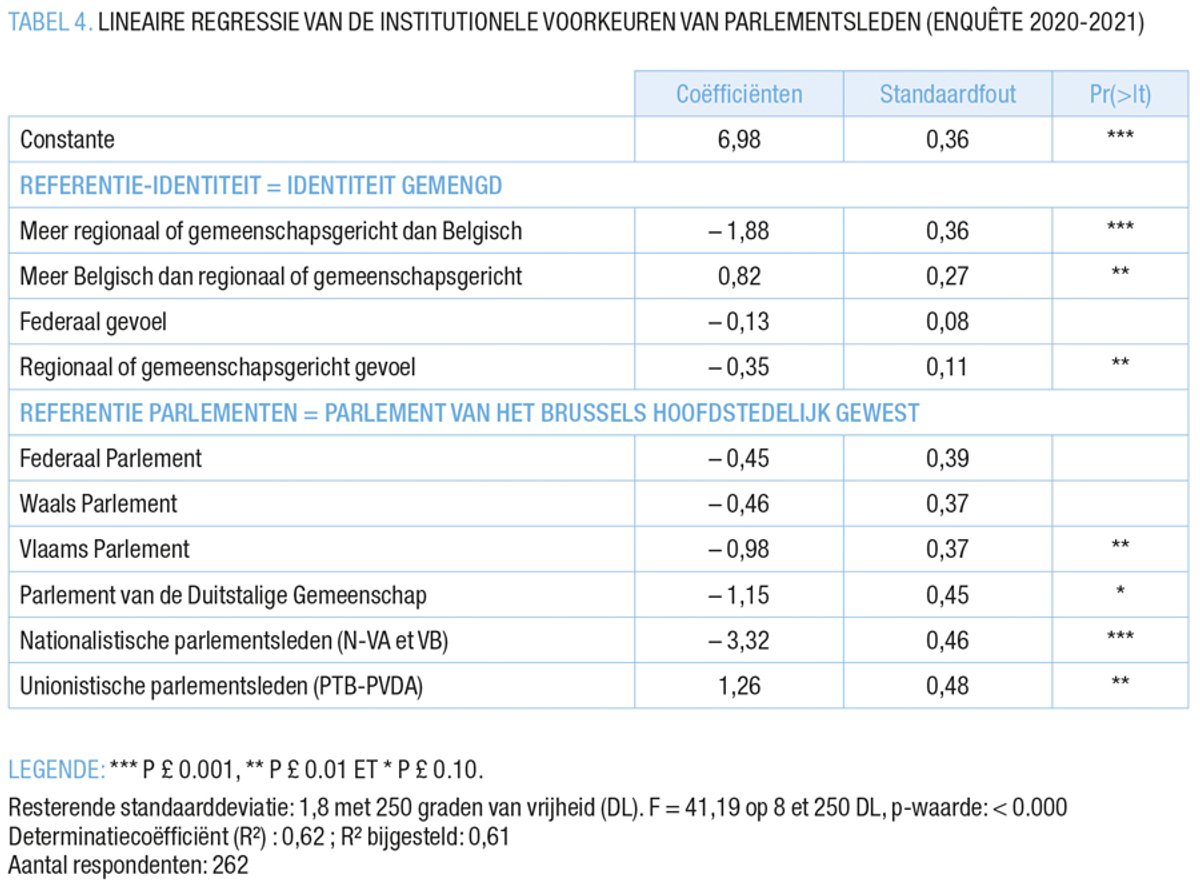 In welke mate spelen nu ook de individuele kenmerken van parlementsleden een rol in hun voorkeuren over bevoegdheidsverdeling? Hiervoor gebruiken we een multivariaat model (waarbij dus rekening wordt gehouden met meerdere variabelen) met als afhankelijke variabele de scores van parlementsleden op de schaal van 0 tot 10 (de institutionele voorkeuren die we trachten te verklaren). Gezien de aard van deze schaal voeren we een lineaire regressie uit. Op geaggregeerd niveau nemen we de variabelen 'parlementen' en 'nationalistische/unionistische parlementsleden' op, aangezien er substantiële verschillen bestaan voor deze twee variabelen, zoals we hierboven zagen. Omgekeerd, aangezien de scores van de partijen sterk op elkaar lijken (met uitzondering dus van N-VA, VB en PTB-PVDA) en deze daarbinnen redelijk verdeeld zijn, voegen we geen 'politieke partij'-variabele als zodanig toe.
