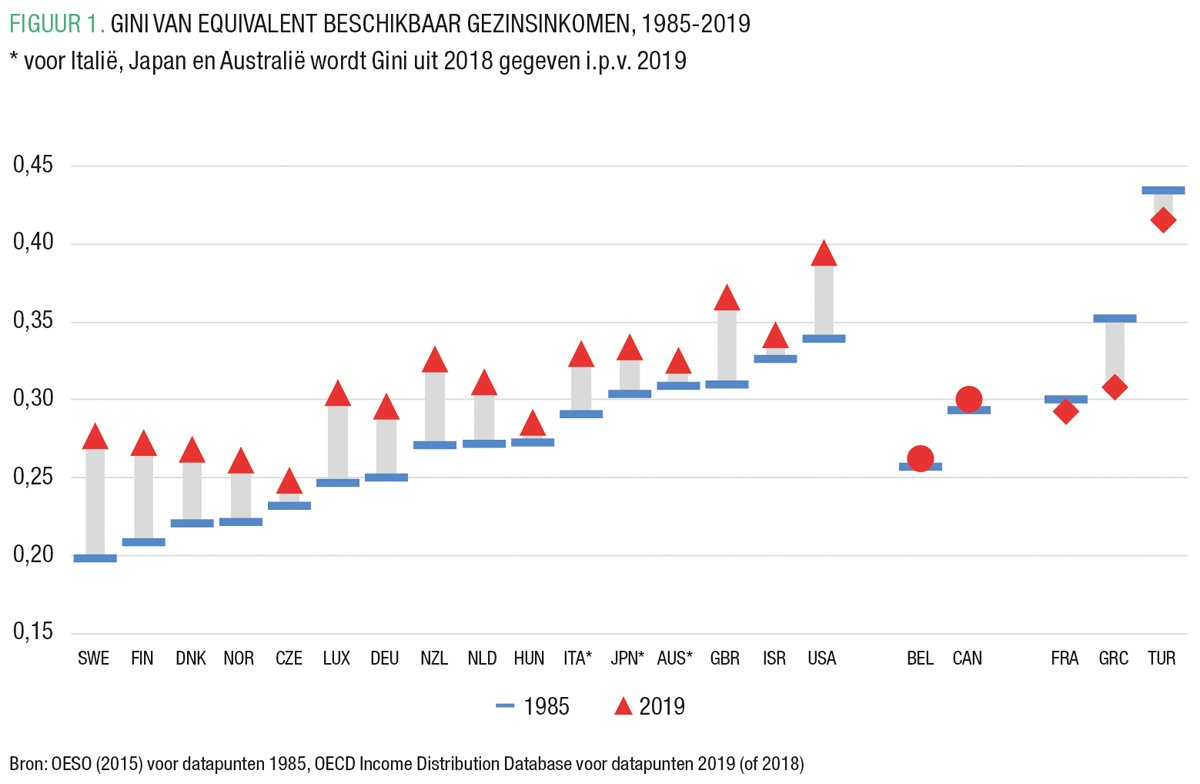 Hoewel de perceptie in ons land in lijn ligt met die in andere landen, stellen recente OESO-rapporten vast dat we een uitzondering vormen op het vlak van de werkelijke evolutie van inkomensongelijkheid. De inkomensongelijkheid zou de afgelopen decennia niet zijn toegenomen, terwijl dat wel het geval is in de meeste andere OESO-landen.2 FIGUUR 1 toont de evolutie van de Gini van beschikbaar inkomen op basis van de 'Income Distribution Database' van de OESO vanaf 1985 tot het meest recent beschikbare jaar, 2019. In de meeste landen is de inkomensongelijkheid toegenomen. In België is dat niet het geval en bleef ze nagenoeg constant.