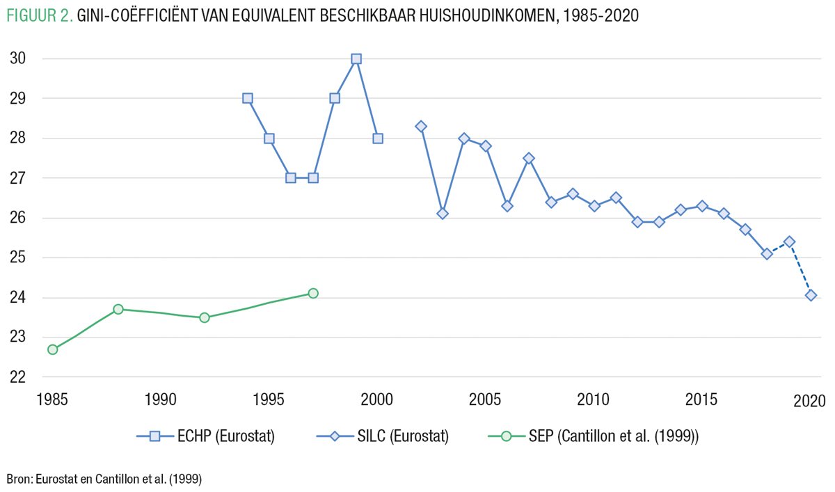 Het gebruik van twee verschillende datasets maakt dat we voorzichtig moeten zijn om conclusies te trekken over de evolutie van inkomensongelijkheid sinds 1994. De datasets kennen belangrijke methodologische verschillen: de manier waarop inkomens worden bevraagd, het bepalen van de steekproef, … Voor de SILC-jaren observeren we vanaf 2002 een meer constante en zelfs dalende trend de laatste jaren. Al is ook hier voorzichtigheid geboden om conclusies te trekken over de hele periode. Vanaf 2018 wordt namelijk een groot deel van de inkomens niet langer bevraagd via een enquête, maar worden de meeste inkomensgegevens gehaald uit administratieve databronnen.7