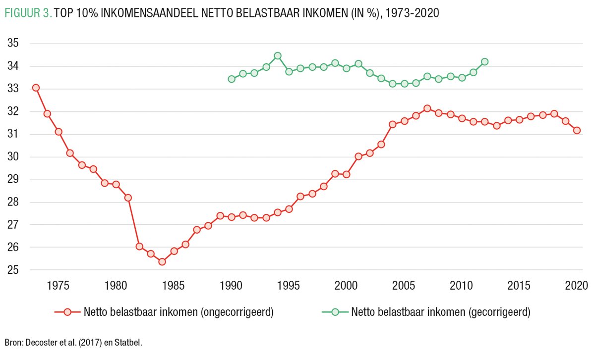 Op basis van enquêtegegevens is het dus niet mogelijk om voor België een consistente reeks te construeren over een periode die teruggaat tot voor de eeuwwisseling. Fiscale data op basis van de aangiftes in de personenbelasting zouden dat in principe wel moeten toelaten. De rode lijn in FIGUUR 3 toont de evolutie van het inkomensaandeel van de 10% hoogste netto belastbare inkomens.9 In 1973 was 33% van al het netto belastbaar inkomen in handen van 10% van alle fiscale huishoudens. Dat aandeel nam in de tien daaropvolgende jaren af tot bijna 25%, waarna het opnieuw toenam tot het stagneerde vanaf 2004 rond 31 à 32%. Deze reeks werd in 2014 onder de aandacht gebracht in De Standaard: 'Topverdieners rukken zich los van de rest'.10