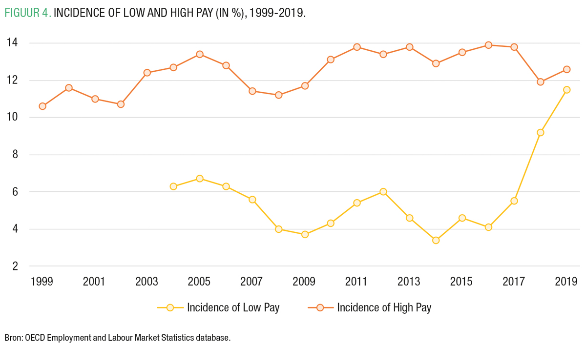 De meeste ongelijkheidsstatistieken geven inderdaad aan dat België de dans van toenemende inkomensongelijkheid ontspringt. Er is echter één datareeks die wijst op toenemende ongelijkheid. De Employment and Labour Market Statistics database van de OESO publiceert jaarlijks enkele indicatoren over de verdeling van bruto lonen van voltijds tewerkgestelden. Twee van die indicatoren, de zogenaamde 'Incidence of Low Pay' en 'Incidence of High Pay', geven weer welk aandeel van voltijds tewerkgestelden respectievelijk minder dan twee derde, dan wel meer dan anderhalve keer het mediaan voltijds bruto maandinkomen verdient. FIGUUR 4 geeft beide indicatoren weer. De recente stijging van de 'Incidence of Low Pay' en de stijgende trend van de 'Incidence of High Pay' wijzen op een toenemende divergentie in de groei tussen lage en hoge lonen. Matthias Somers (Denktank Minerva) haalde deze 'toenemende dualisering tussen lage en hoge lonen' reeds aan in het SamPol-nummer van november 2022. Maar desondanks wijzen de eerder getoonde cijfers er niet op dat deze trend zich vertaalt in toenemende ongelijkheid in beschikbaar inkomen.