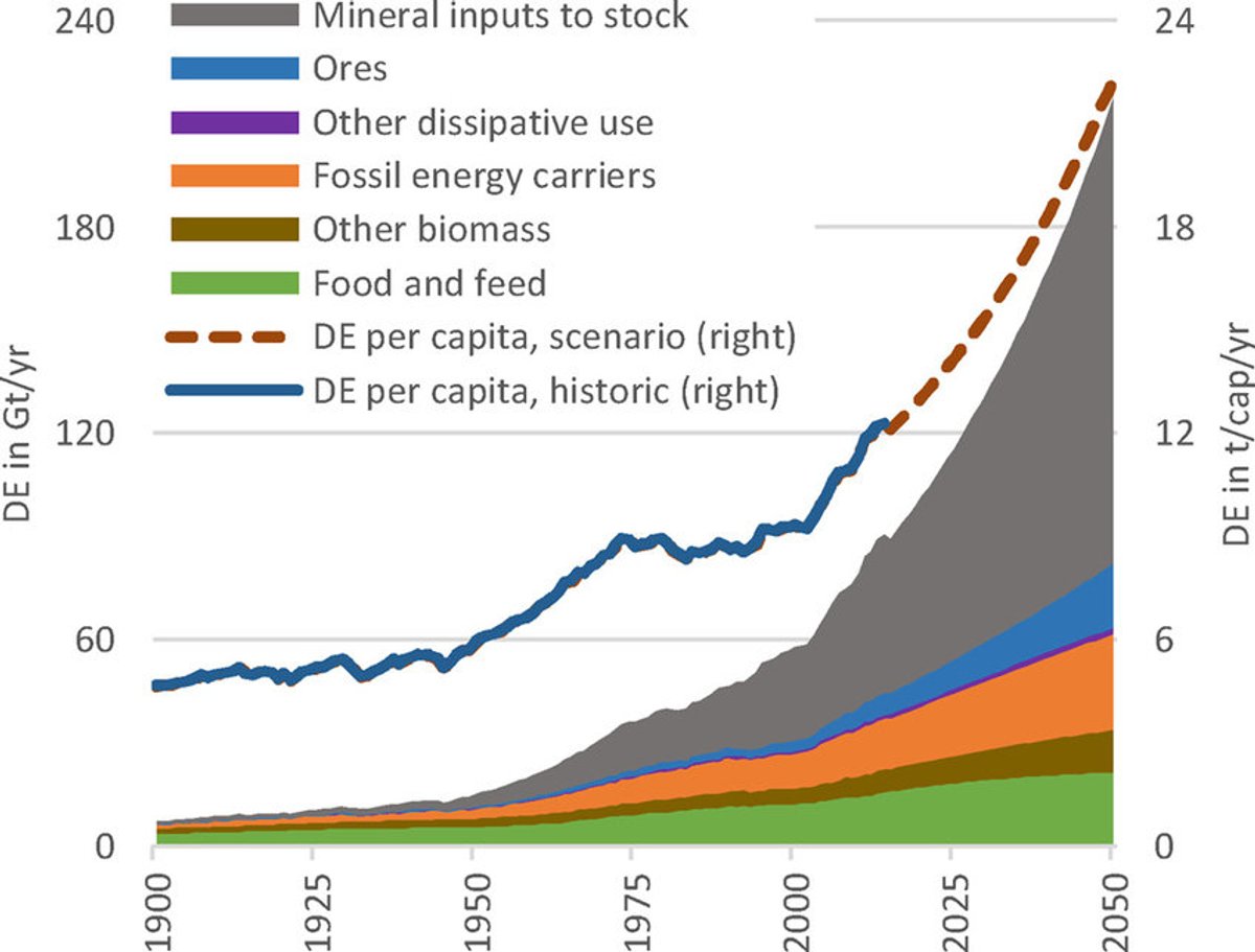 Alarmerend is hierbij is dat deze collectieve honger naar grondstoffen – het 'globale socio-economische metabolisme' – alsmaar groter wordt: onze materiële extractie stijgt, in absolute cijfers maar ook in relatieve cijfers per kop, nog sneller dan tijdens de naoorlogse wederopbouw. Sinds de verschijning van het rapport van de Club van Rome (1972), dat ecologische limieten aan onze economie stelde, verdrievoudigde ons materiaalgebruik. Intussen zijn hierbij 5 van de 9 planetaire grenzen reeds overschreden, waaronder klimaatopwarming, biodiversiteit, stikstof en chemicaliën.