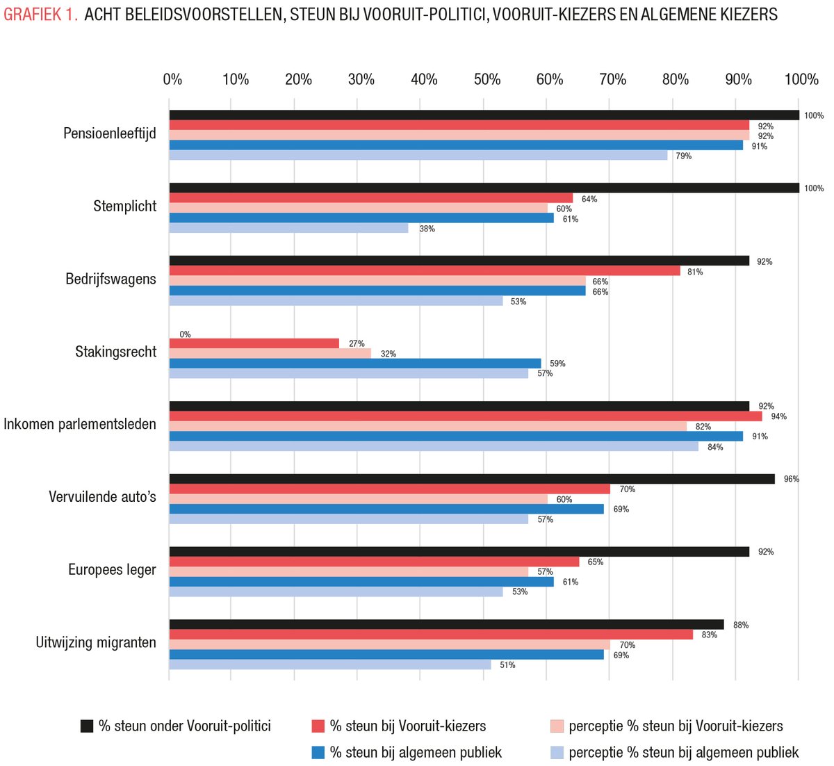 Aan ons onderzoek in het voorjaar van 2018 namen 26 Vooruit-politici deel, allemaal Vlaamse of nationale parlementsleden of partijleider – 81% van de Vooruit-politici beantwoordde dus onze vragen. We vroegen die politici eerst naar hun eigen mening over acht specifieke beleidsvoorstellen; we nemen aan dat de eigen mening van de politici hun ideologie weerspiegelt. Daarna vroegen we naar hoeveel percent van de Vlaamse kiezers in het algemeen en van hun eigen partij-electoraat die voorstellen steunt, dat is onze meting van de perceptie van de publieke opinie. Parallel daarmee deden we een bevraging onder de Vlamingen (waaronder Vooruit-kiezers), die we naar hun eigen mening over de acht voorstellen vroegen. Door de perceptie van de werkelijke opinie af te trekken, gaan we na hoe sterk en in welke richting de percepties van politici van de realiteit afwijken. Er kan worden gediscussieerd over de representativiteit en de verwoording van de acht beleidsvoorstellen, maar dit waren ze: (1) De pensioenleeftijd mag niet verder stijgen dan 67 jaar, (2) Bedrijfswagens moeten zwaarder worden belast, (3) De opkomstplicht moet behouden blijven, (4) Het stakingsrecht moet worden ingeperkt, (5) Alle inkomsten van elk parlementslid moeten jaarlijks bekend worden gemaakt, (6) In steden moeten de meest vervuilende wagens verboden worden, (7) België mag nooit iemand uitwijzen naar een land waar mensenrechten geschonden worden, (8) Nationale legers zouden vervangen moeten worden door één Europees leger. De eerste vier (pensioenleeftijd, bedrijfswagens, stakingsrecht, opkomstplicht) zijn typische economische links-rechts-thema's, de laatste drie (vervuilende wagens, migranten, Europees leger) zijn sociaal-cultureel links-rechts.