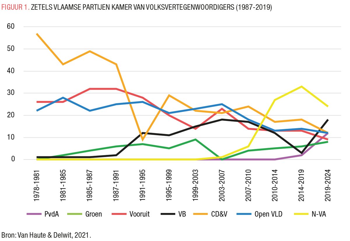 In West-Europa kregen sociaaldemocratische partijen te kampen met de ene verkiezingsnederlaag na de andere. Sommige partijen – zoals PS in Frankrijk en PvdA in Nederland – doken onder de symbolische ondergrens van 10%. Ook Vooruit boette vanuit historisch opzicht veel stemmen in (FIGUUR 1). Zo kon de partij nooit haar resultaat na de klinkende overwinning in 2003 onder wijlen Steve Stevaert (23 zetels) nog evenaren. Over de oorzaken van deze terugval vloeide reeds veel inkt.