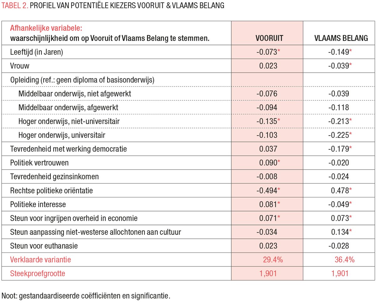 In hoeverre hebben, tot slot, potentiële kiezers van Vlaams Belang en Vooruit een gelijkaardig profiel? Ik rapporteer hiertoe resultaten van een regressieanalyse (TABEL 2). Positieve coëfficiënten wijzen op een positief verband en negatieve coëfficiënten op een negatief verband tussen de waarschijnlijkheid om voor respectievelijk Vooruit/Vlaams Belang te stemmen en de verschillende verklaringsgronden. Enkel verbanden aangeduid met een asterisk (*) zijn statistisch significant, d.w.z. onwaarschijnlijk te wijten aan toeval. Wat blijkt? Vrouwen zijn minder geneigd om voor Vlaams Belang te stemmen, en zowel Vooruit als Vlaams Belang trekken jongere kiezers aan. Kiezers met een hoger opleidingsniveau zijn minder geneigd voor Vlaams Belang en Vooruit te stemmen, vergeleken met kiezers zonder diploma of diploma basisonderwijs. Verder verschillen beide groepen sterk: vertrouwen in de politiek, tevredenheid met de werking van democratie in België, een linkse politieke oriëntatie en politieke interesse houden positief verband met de waarschijnlijkheid om op Vooruit te stemmen en vice versa voor Vlaams Belang. Als we twee sociaal-culturele stellingen (steun voor euthanasie en aanpassing niet-westerse allochtonen aan de cultuur) en een sociaal-economische stelling (regulering economie) bekijken, valt op dat de steun voor overheidsingrijpen in de economie positief correleert met kiesintenties voor beide partijen. Steun voor de aanpassing van niet-westerse allochtonen aan de cultuur houdt positief verband met grotere waarschijnlijk voor Vlaams Belang te stemmen.