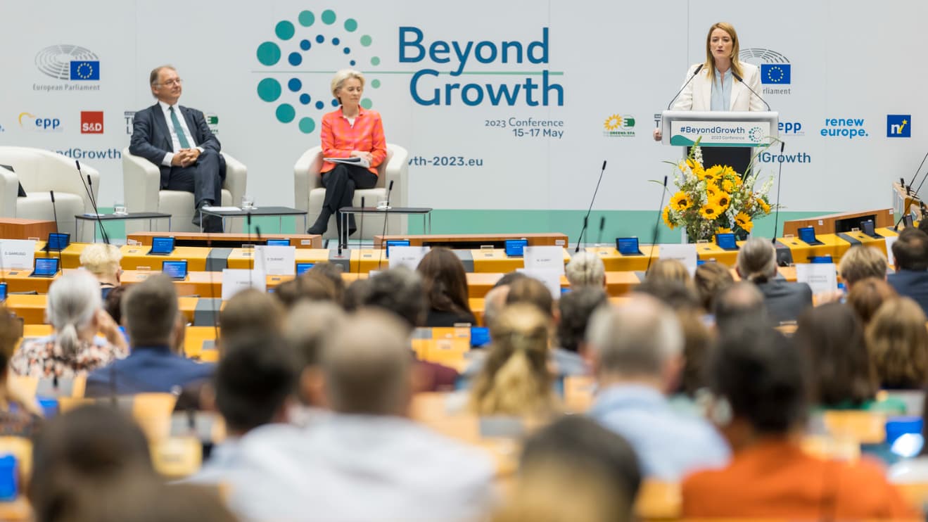 'Het gebeurt niet vaak dat we jonge mensen in deze ruimte hebben.' Daarmee opende Roberta Metsola haar speech voor de Beyond Growth 2023 Conference (15-17 mei) aan een tot de nok gevuld Europees Parlement. Het was haar als voorzitter van dat parlement natuurlijk opgevallen dat het publiek nogal wat verschilde van haar gebruikelijke toehoorders. De driedaagse conferentie over alternatieven voor het huidige groeimodel van de EU vulde de gangen en zalen van het Europees Parlement met meer dan duizend geïnteresseerden.